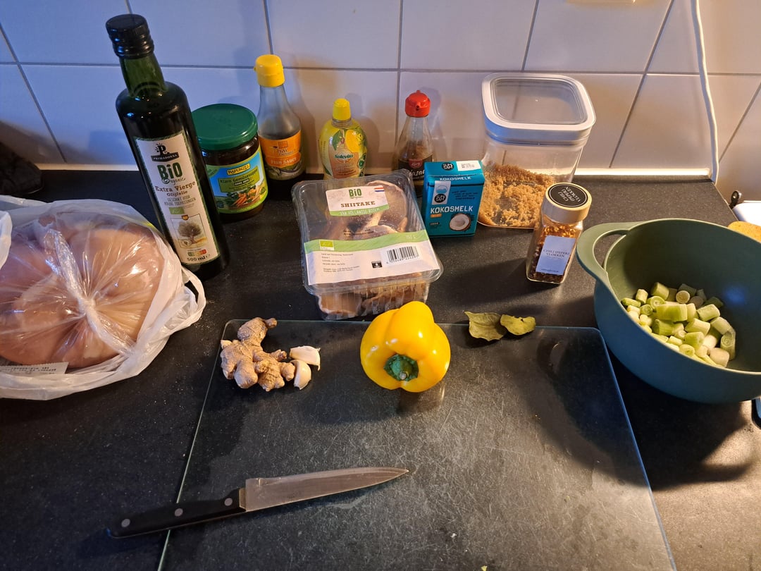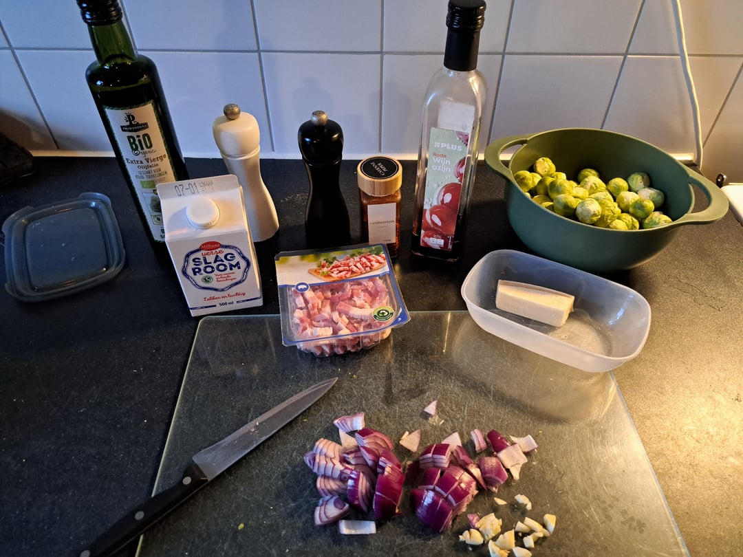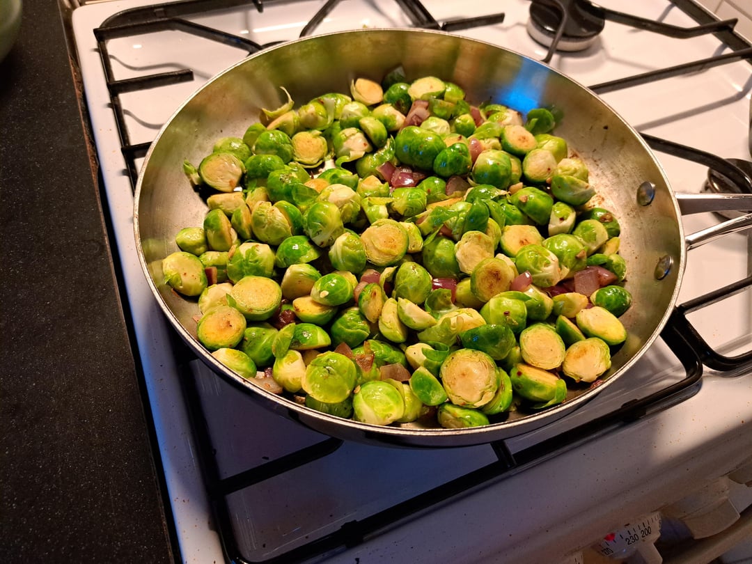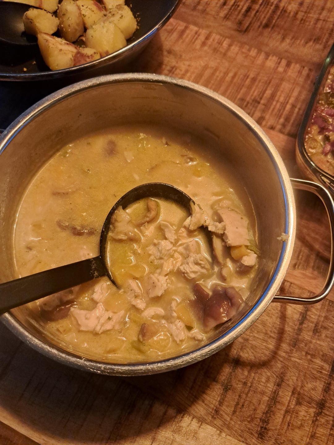 Dinner: lowcarb Brussel Sprouts, Tom kha gai soup, and leftovers: Arabian chicken and baked potatoes. For desert: mixed forest fruit, banana and Greek yoghurt