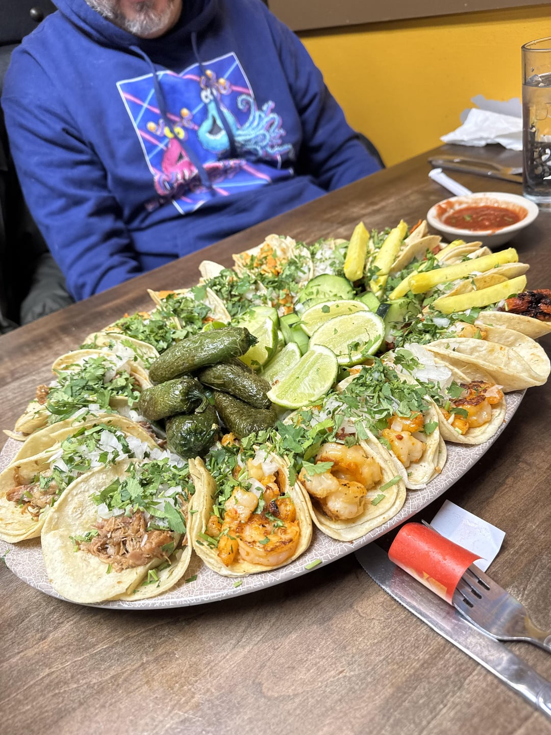 This is a 10/10. I’ve lived near here for 20 years and somehow missed this place. They have 15 proteins to choose from. This was the 20 taco platter with pastor, carnitas, chicken and shrimp. All excellent. I don’t post often so I joined this sub because it’s a hidden gem.
