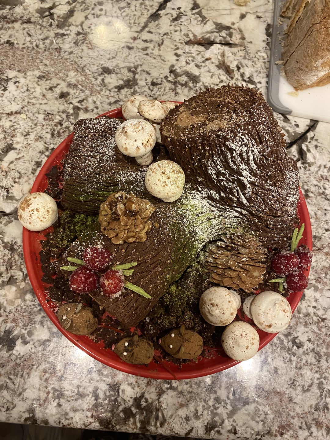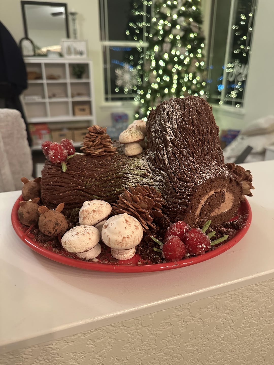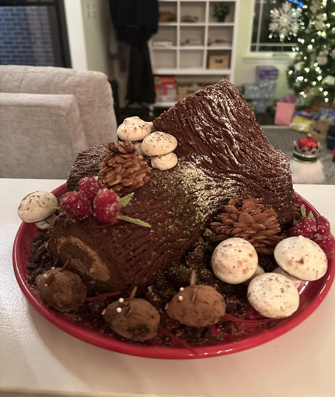 I loved seeing Reddit posts last year of Yule logs and couldn’t wait to make my own! This was my first time making a rolled cake and I followed the Claire Saffitz Dessert Person recipe for the sponge and filling. I decorated with truffle mice, almond, truffle pine cones, merengue mushrooms, and raspberries with matcha and white chocolate leaves.