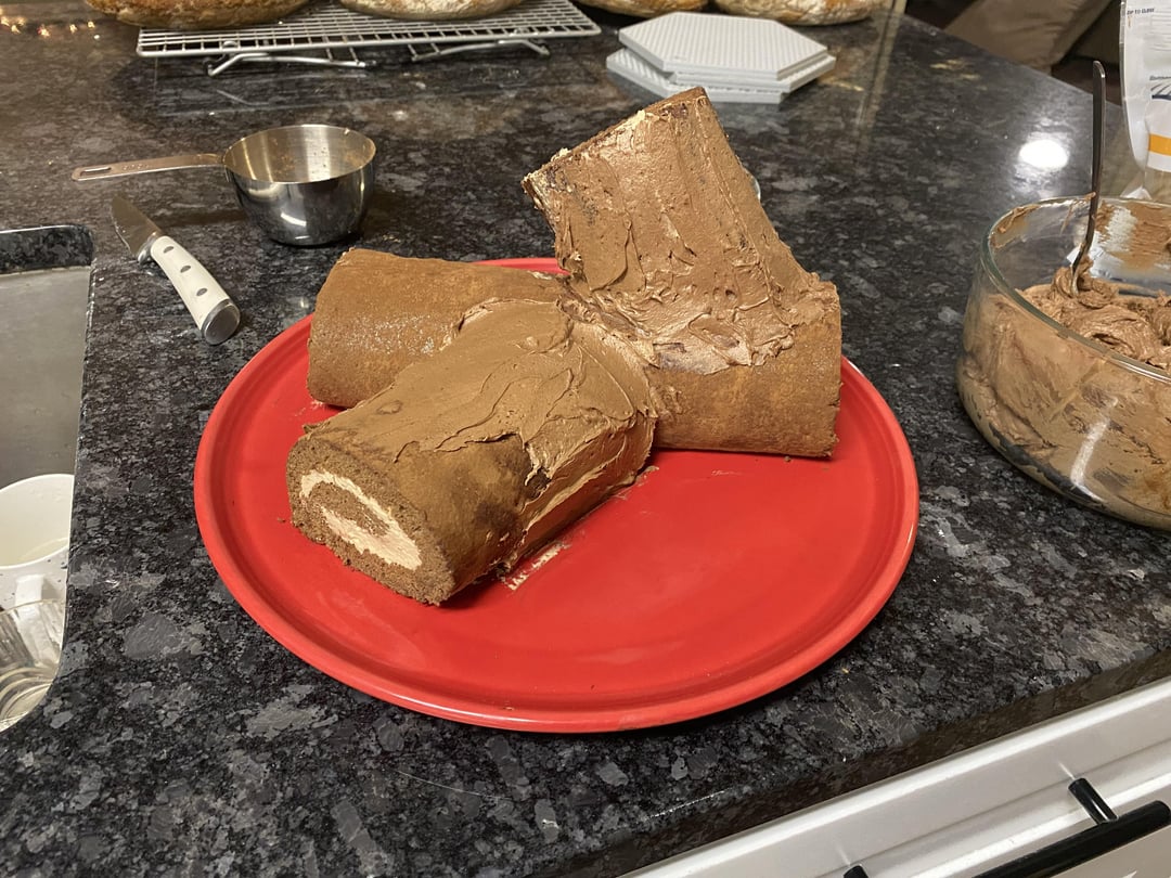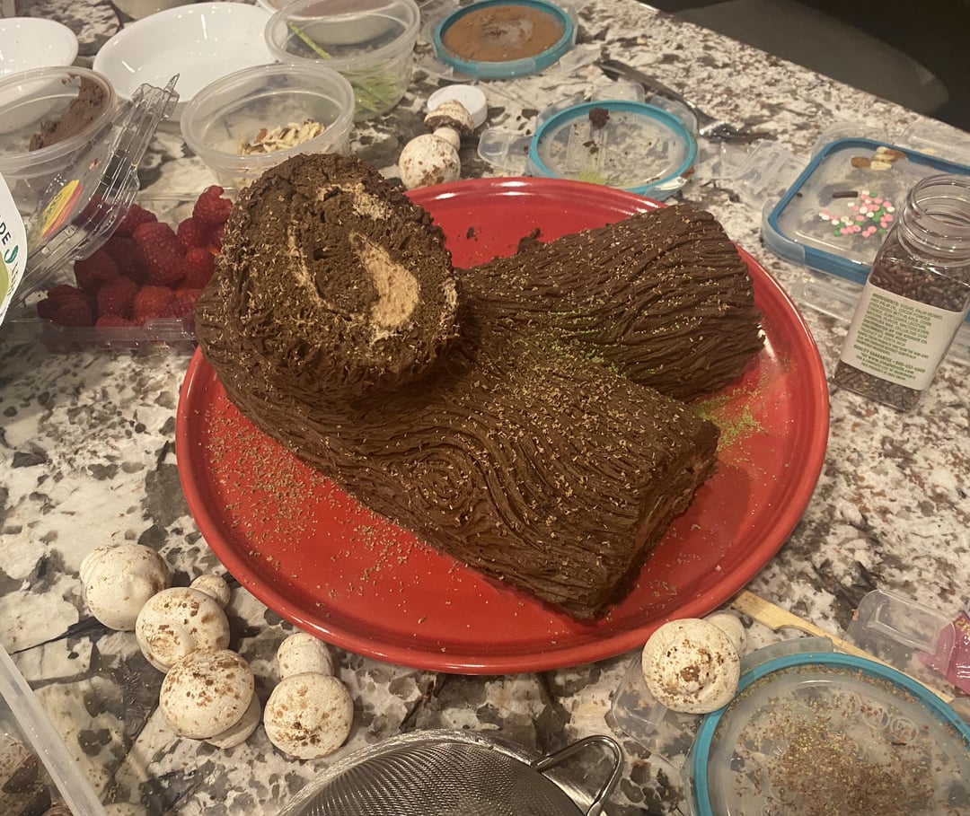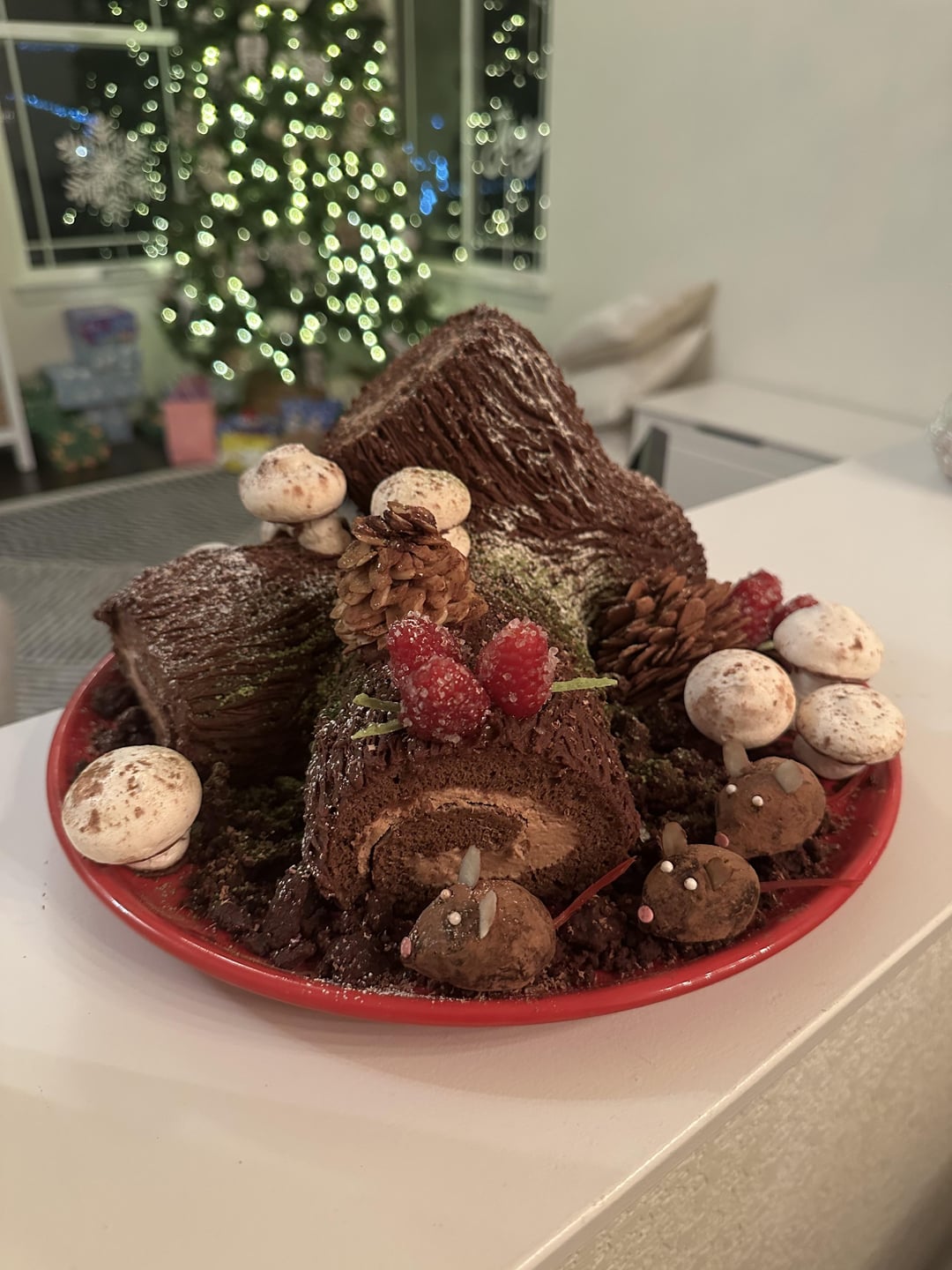 I loved seeing Reddit posts last year of Yule logs and couldn’t wait to make my own! This was my first time making a rolled cake and I followed the Claire Saffitz Dessert Person recipe for the sponge and filling. I decorated with truffle mice, almond, truffle pine cones, merengue mushrooms, and raspberries with matcha and white chocolate leaves.