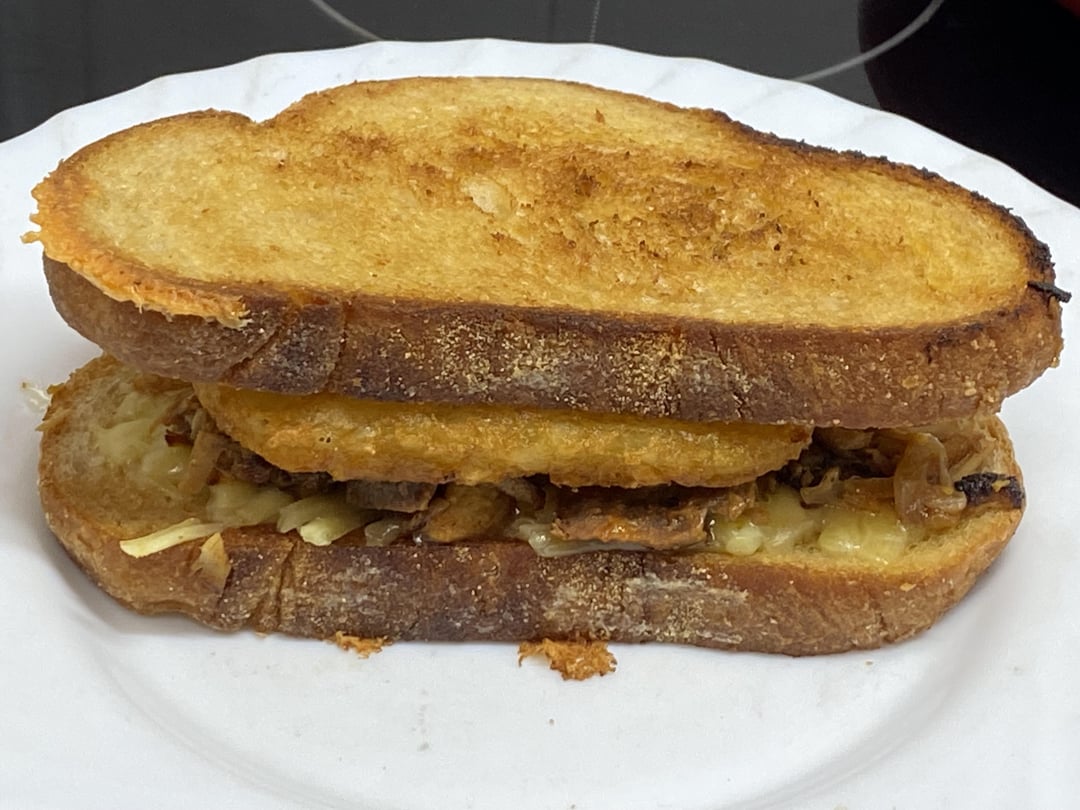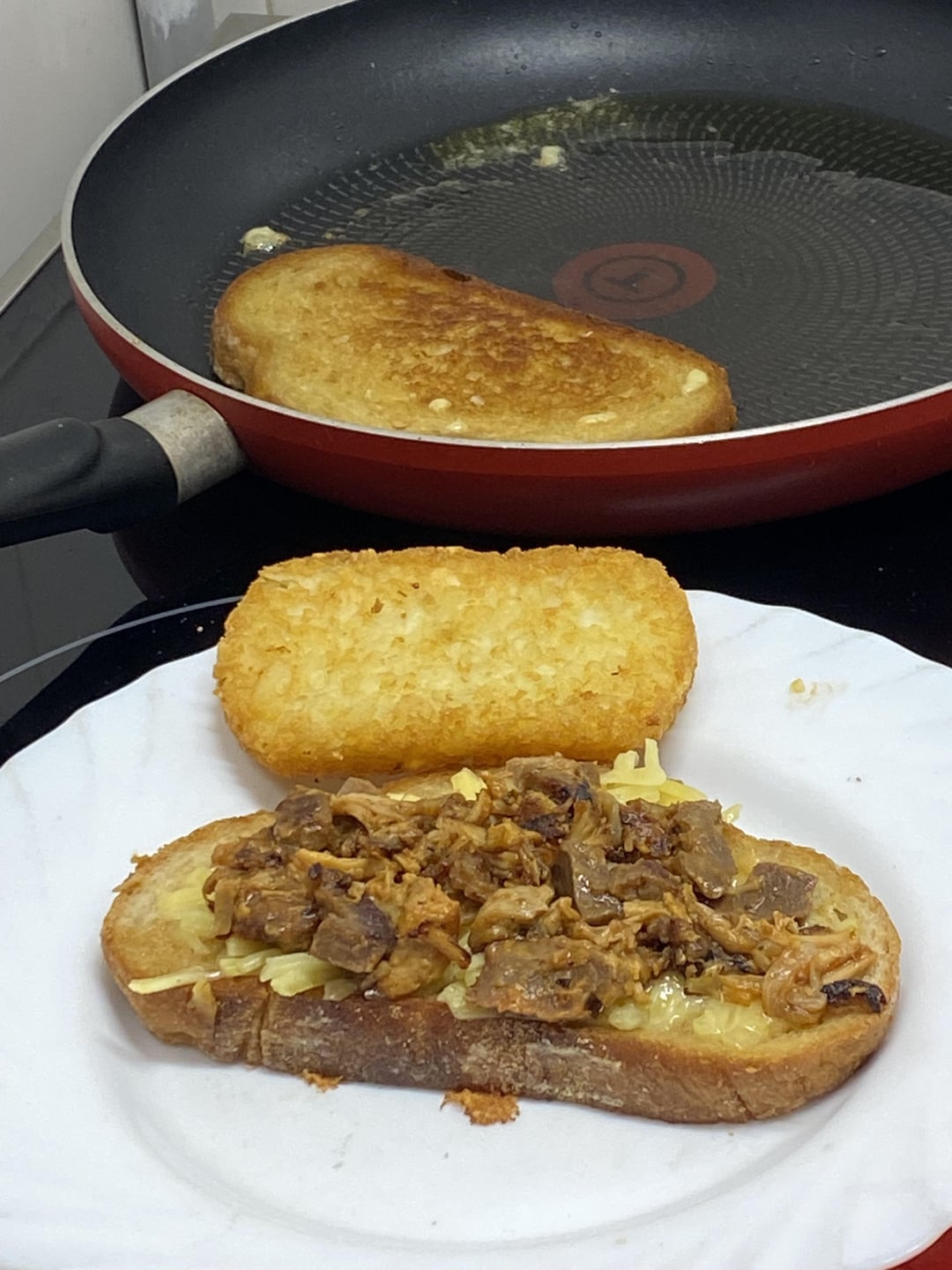 The meat is a chicken and lamb combo yiros meat with onions. It’s from an AB (atomic bomb in Adelaide, South Australia) which is a pile of chips covered in yiros meat topped with three sauces – garlic, tomato and Bbq. The cheese is shredded vintage that’s kept in the freezer. Hash brown, also from the freezer. Ciabatta sliced loaf – you guessed it, freezer. I live alone and don’t go through food fast enough to not freeze it. Anyway, it was delicious!
