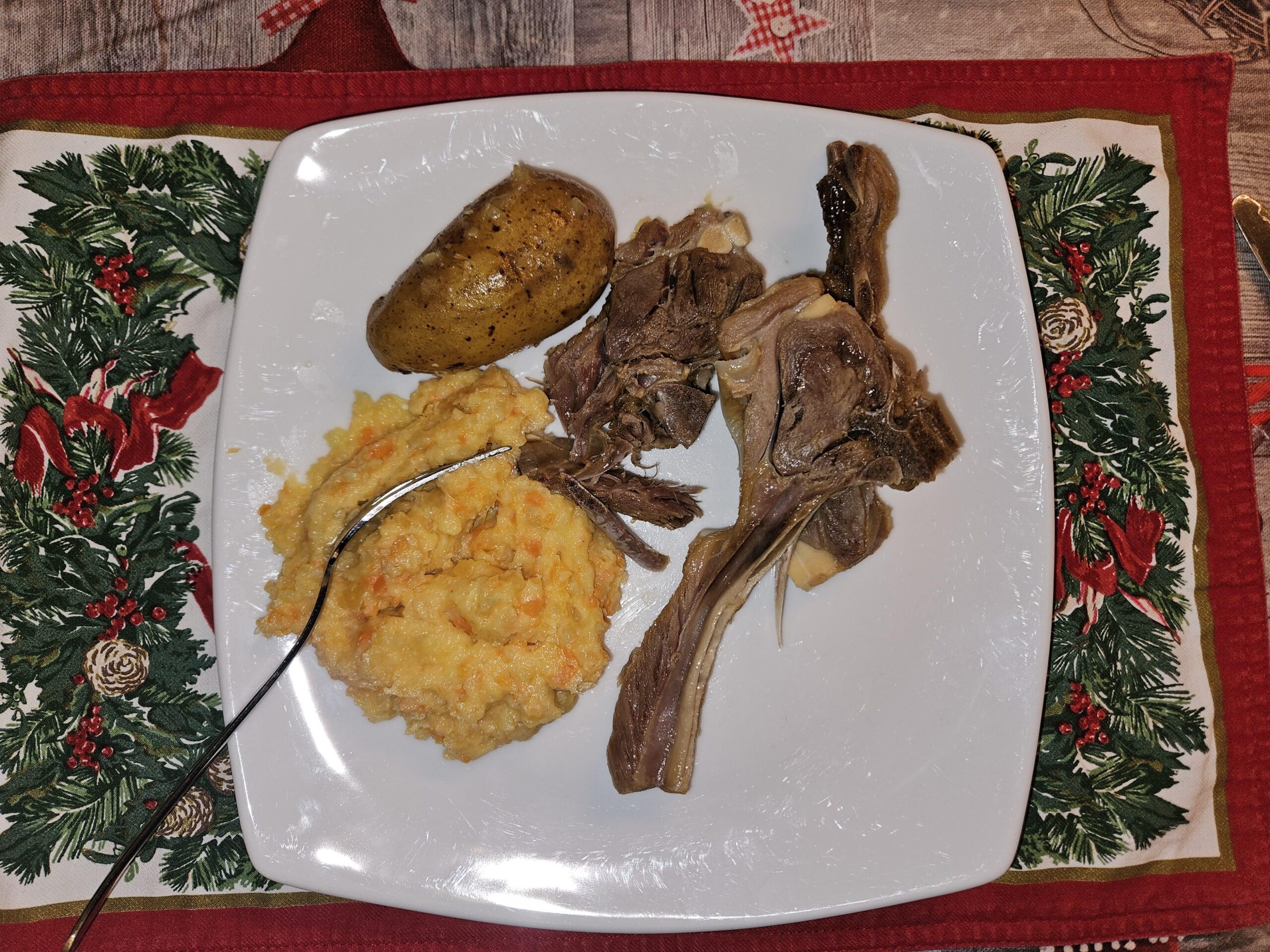Pinnekjøtt (stick meat) with root veg mash and potatoes. Well, one potato for me. God jul!