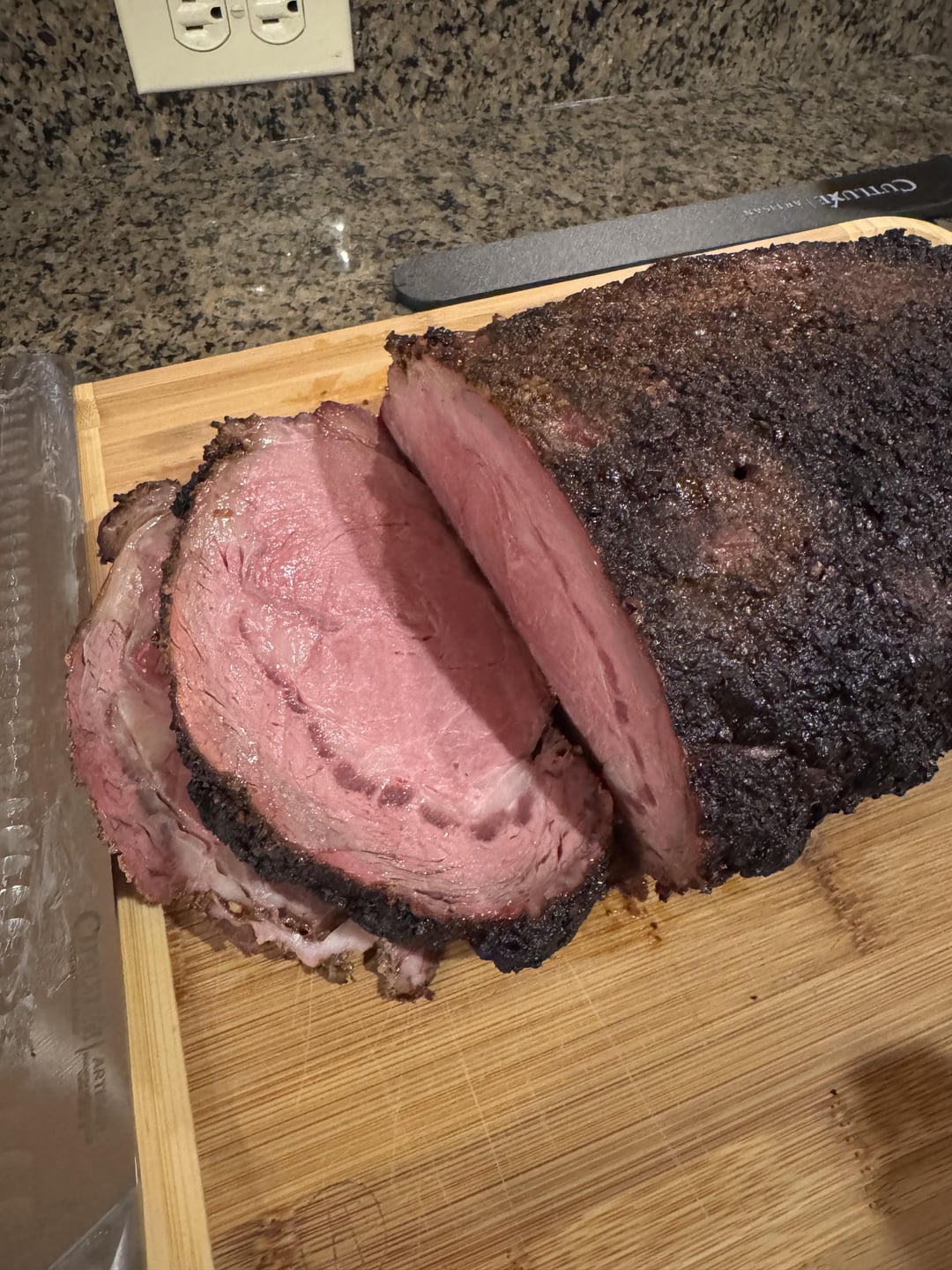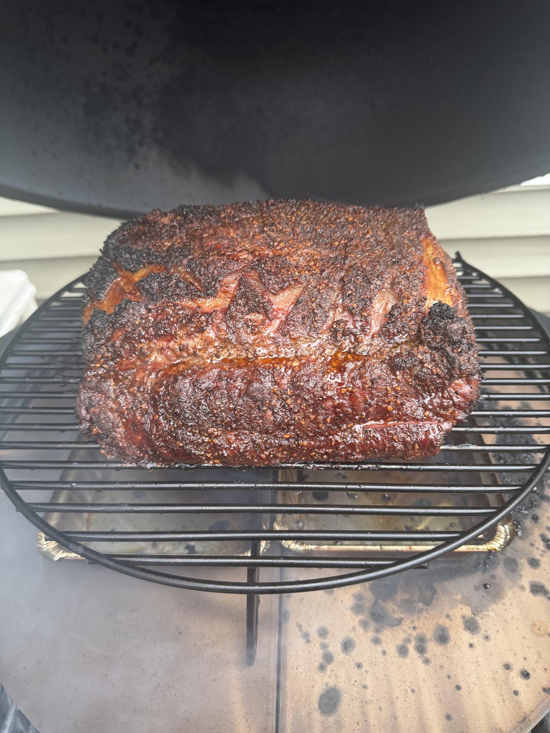 I thought I would do prime rib for Christmas today. I bought this one at the local butcher. I smoked it at 250 until reaching 120 with a few hunks of oak. Then heated it up to 500 degrees to finish for 10 minutes. It got more char on the outside that I expected which worried me but it tasted good. It was maybe a little more done than I expected but that isn’t a problem for my family.