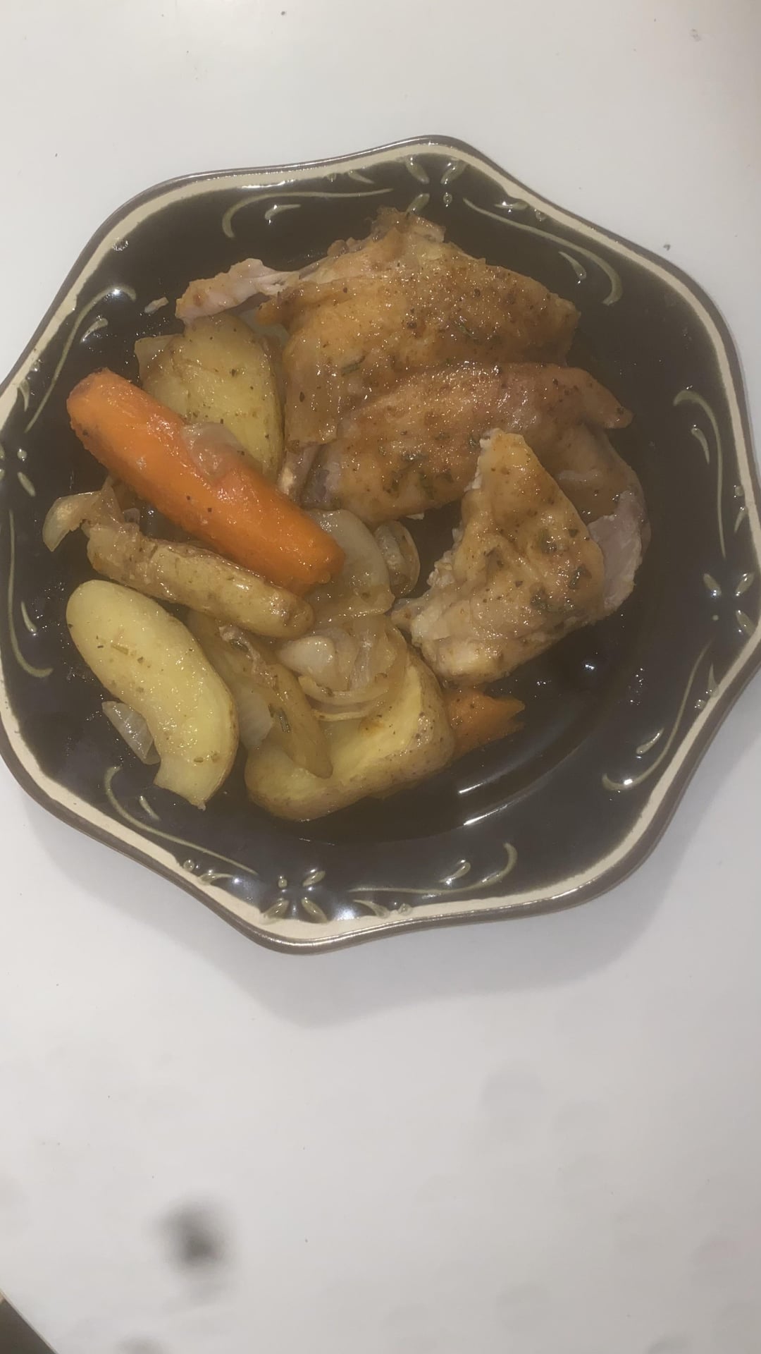 With fingerling potatoes, carrots, and lemon pepper sauce.