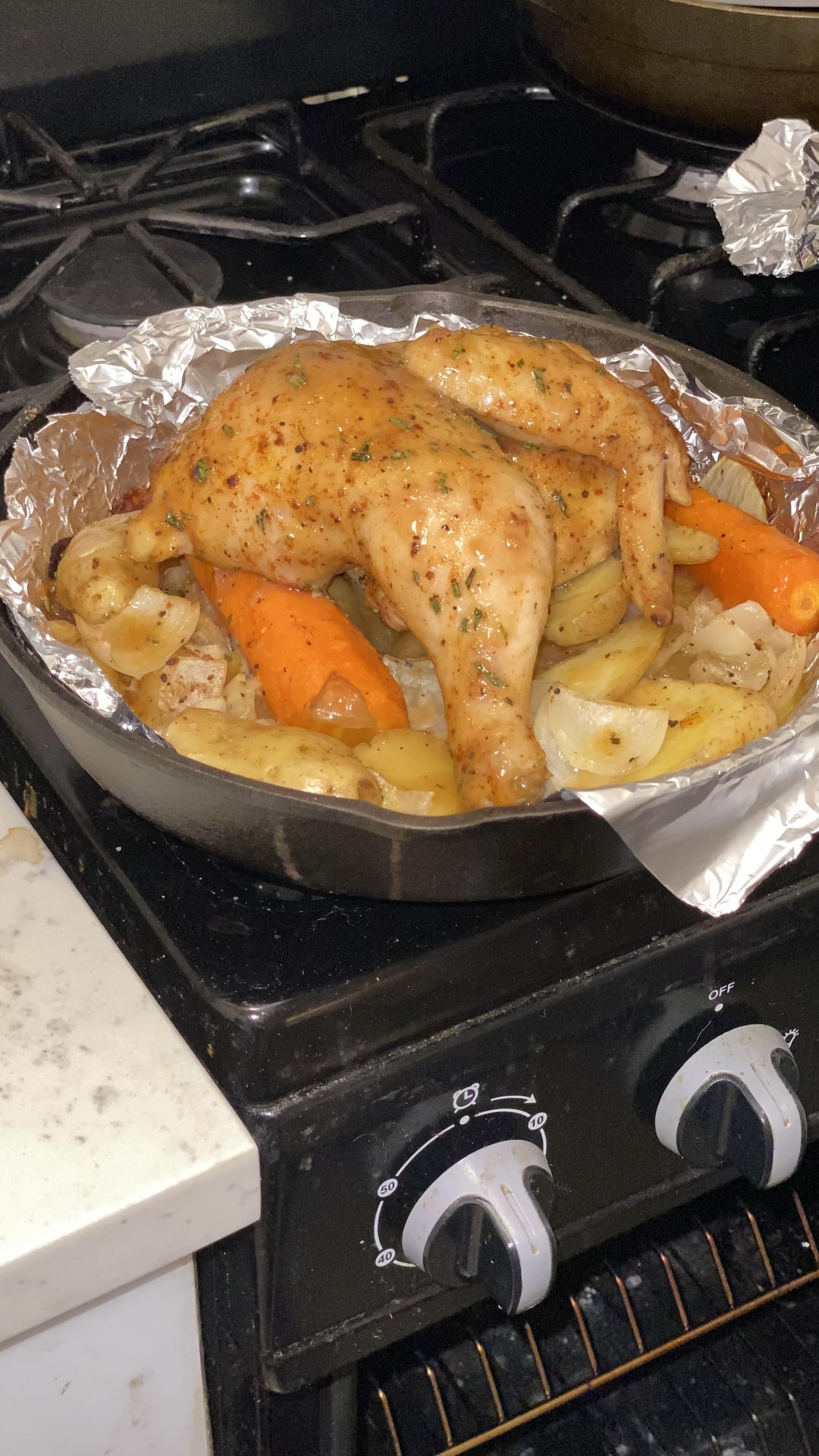 I cooked in cast iron with the chicken on top of the veggies and put it back in the oven a bit after glazing.