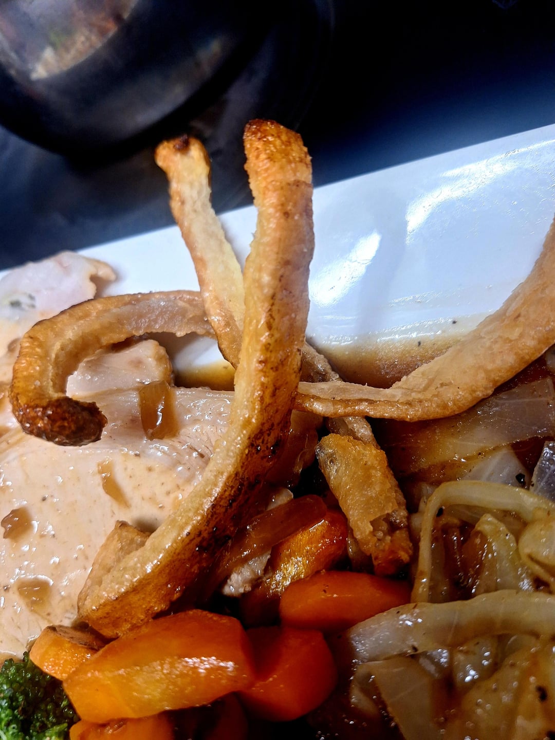 Roast pork, goose 'tatoes, Dijon cauliflower cheese, honey carrots, buttered cabbage and roasted broccoli. Honey apple gravy 😊by pink_flamingo2003 Write A CommentYou must be logged in to post a comment.