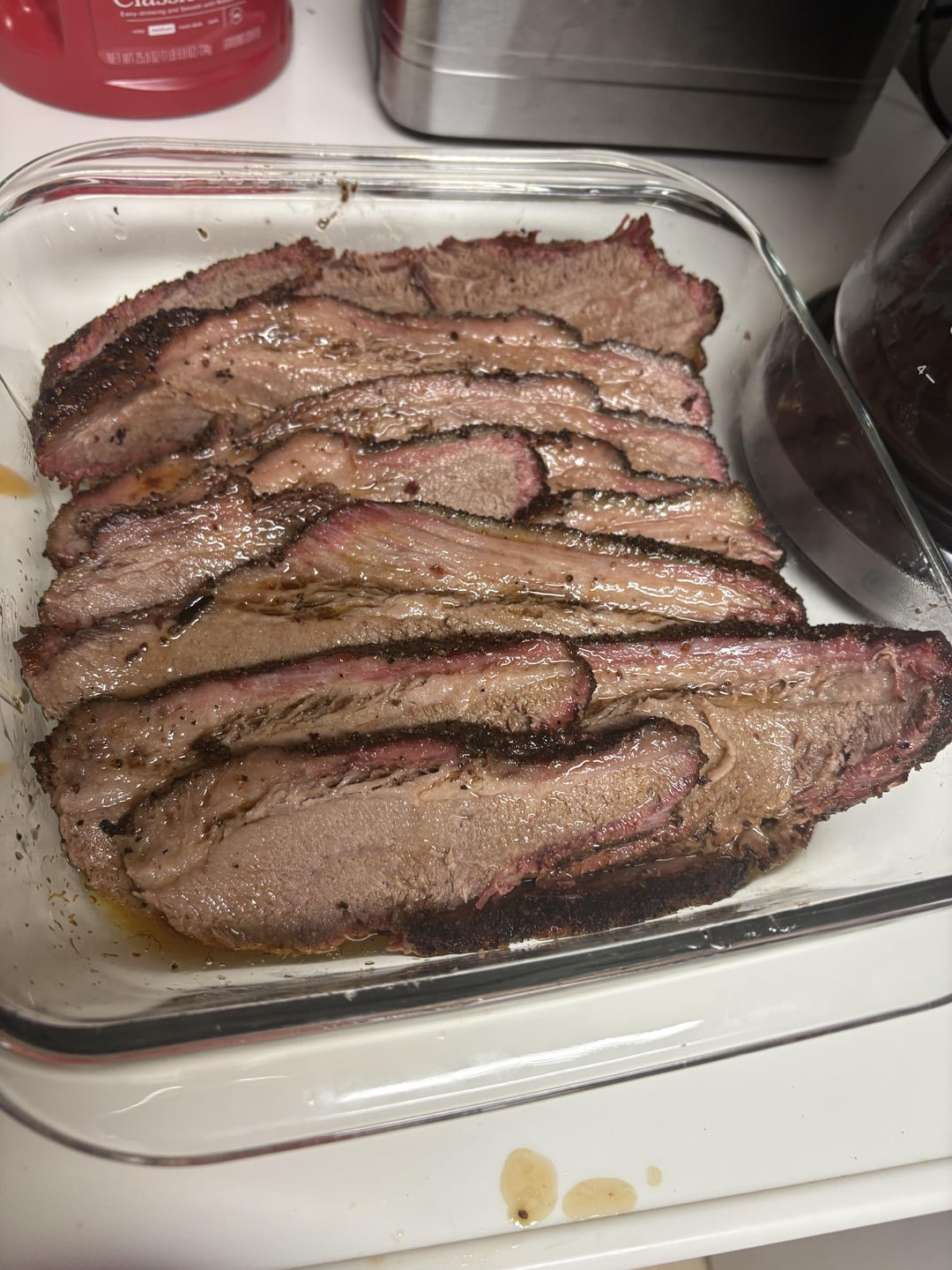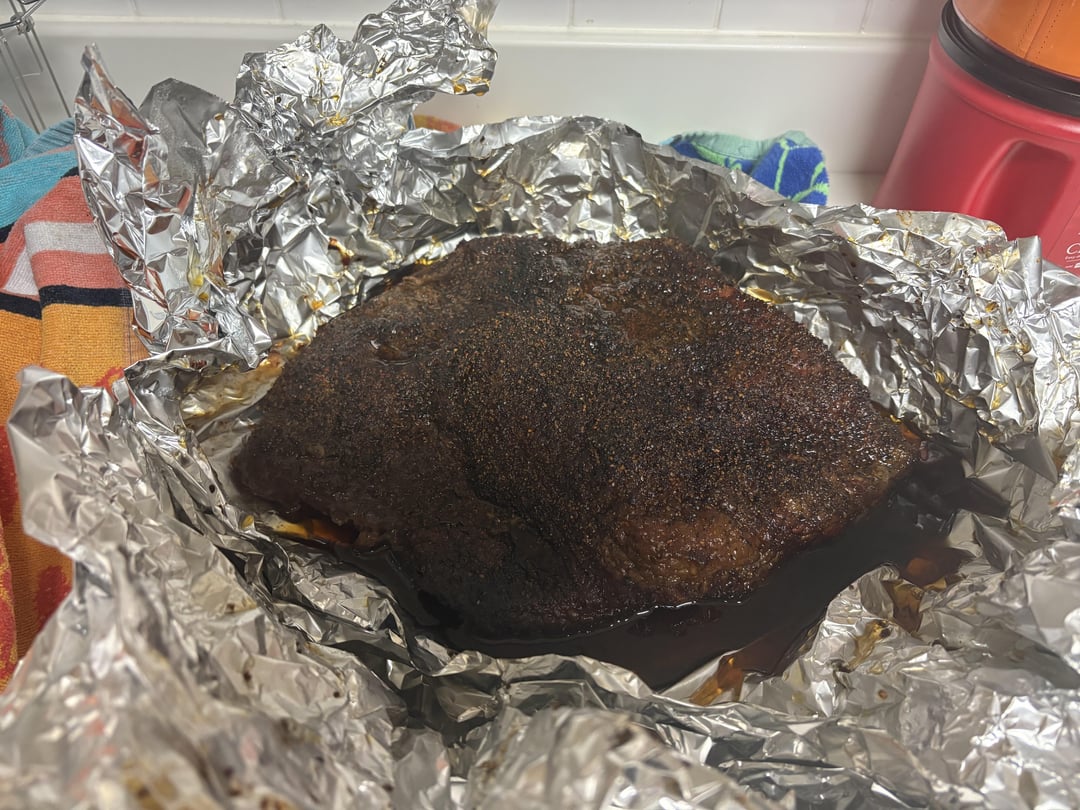 10 hours at 190 till 160 internal. Wrapped. Poured on tallow rendered from the trim. 2 hours at 250 till 200 internal.