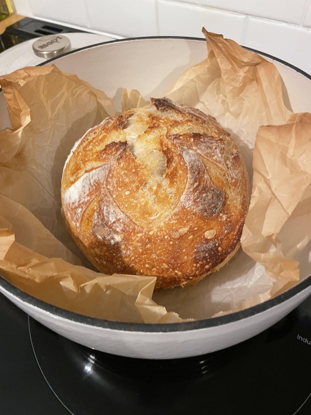 -Preheat oven to 500 with dutch oven inside, after resting 30 mins inside proofing bowl i pulled the dough out and scored it and placed into hot dutch oven once it was preheated. (i also donβt have proper tools to score bread yet, so just used sharp chef knife.)