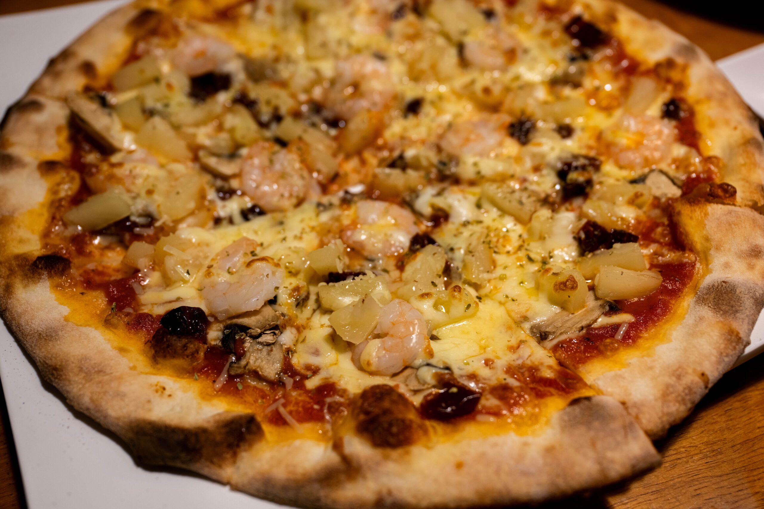 Shrimp, pineapple, sun-dried tomatoes, and mushrooms. I’d send them straight to pizza jail myself, but they finished the whole thing so I ain’t mad.