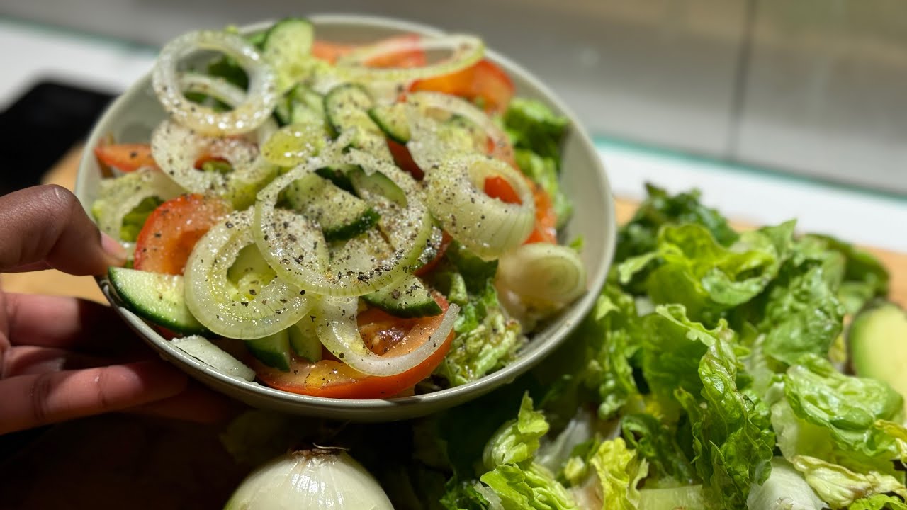 Lettuce, tomatoes, onion and cucumber are a must in the salad. It’s tastes best with fresh and crunch and juicy ingredients. How much of each you add in is up to you.