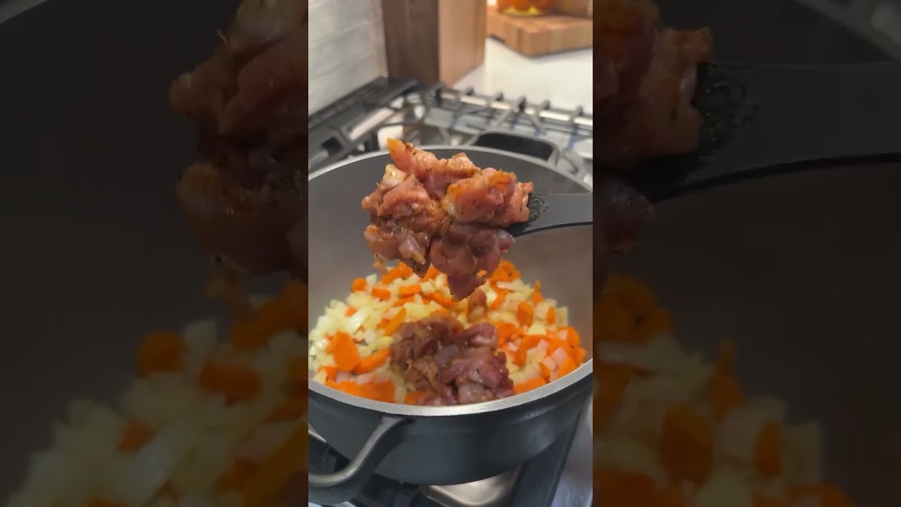 3. Then add the seasoned chicken to the pot, followed by 6-8 cups chicken stock or broth. Bring to a boil, then reduce to a simmer. Let it cook for 25-30 minutes.