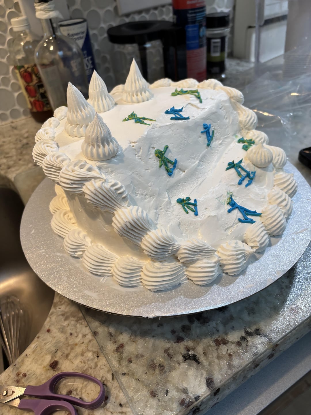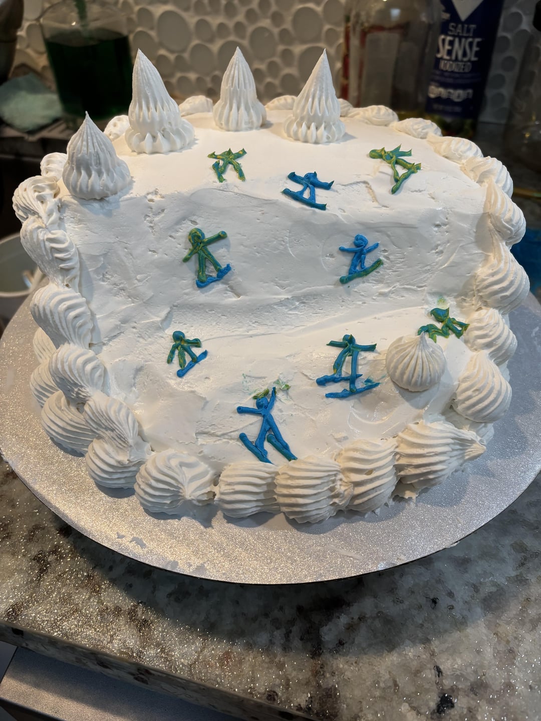 This cake was inspired by another post in this sub. Theirs had a lot more detail in the skiers. I ran out of piping bags so I had to stick to this blue and yellow swirl for the skiers