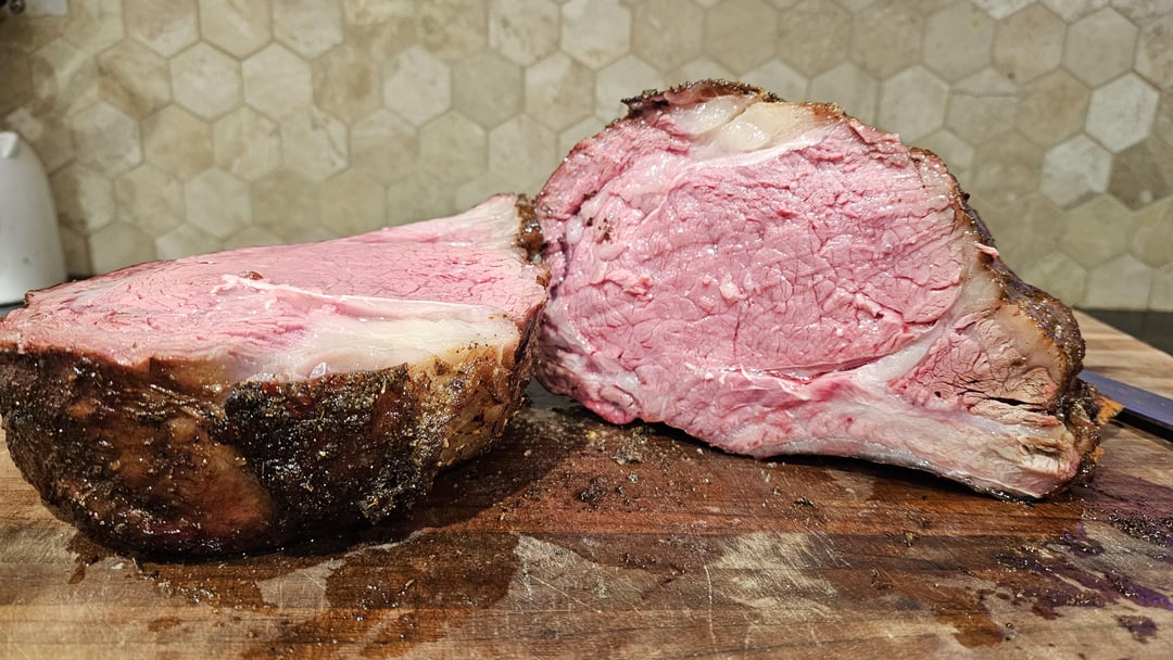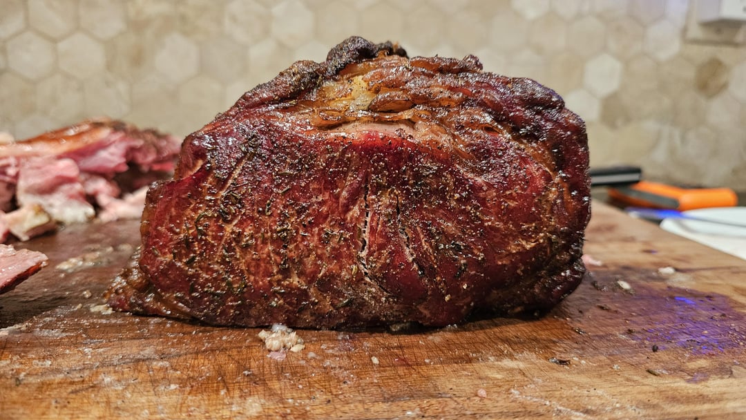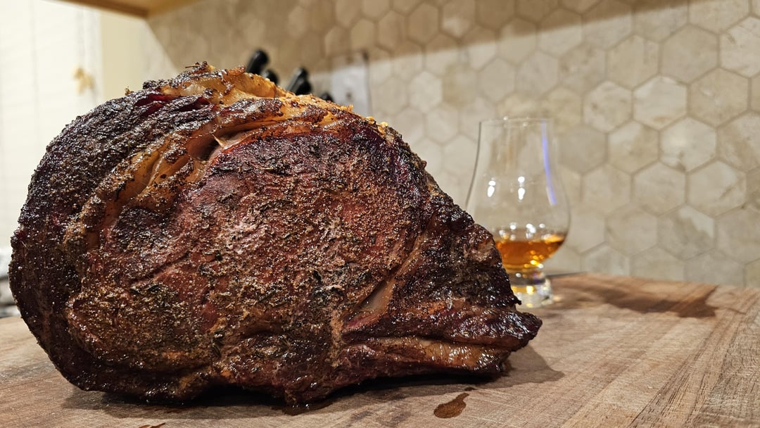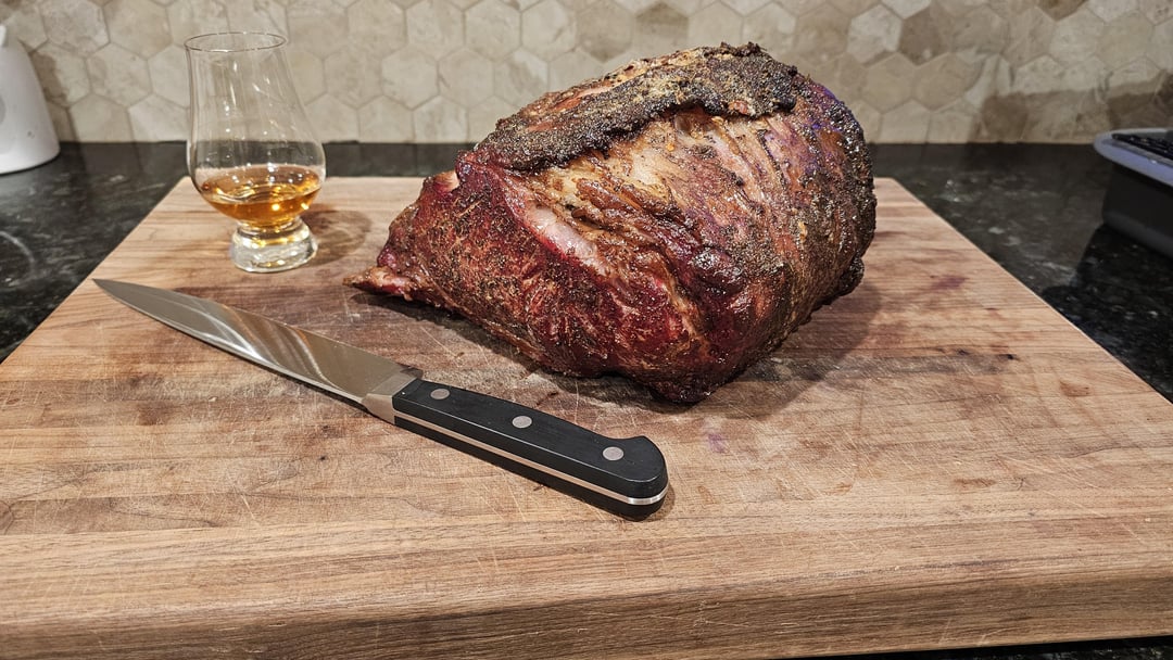 My first attempt… Clearly did not trim enough fat. Kept the bones in and didn't use any twine. 24hr dry brine followed by a coating of salt, pepper, garlic, and thyme. Kettle indirect @ 275 til 115 internal, then rested til 120~. Total cook + rest = 3hr. Even cook, very tasty. Happy with the result! Merry Christmas 🥳