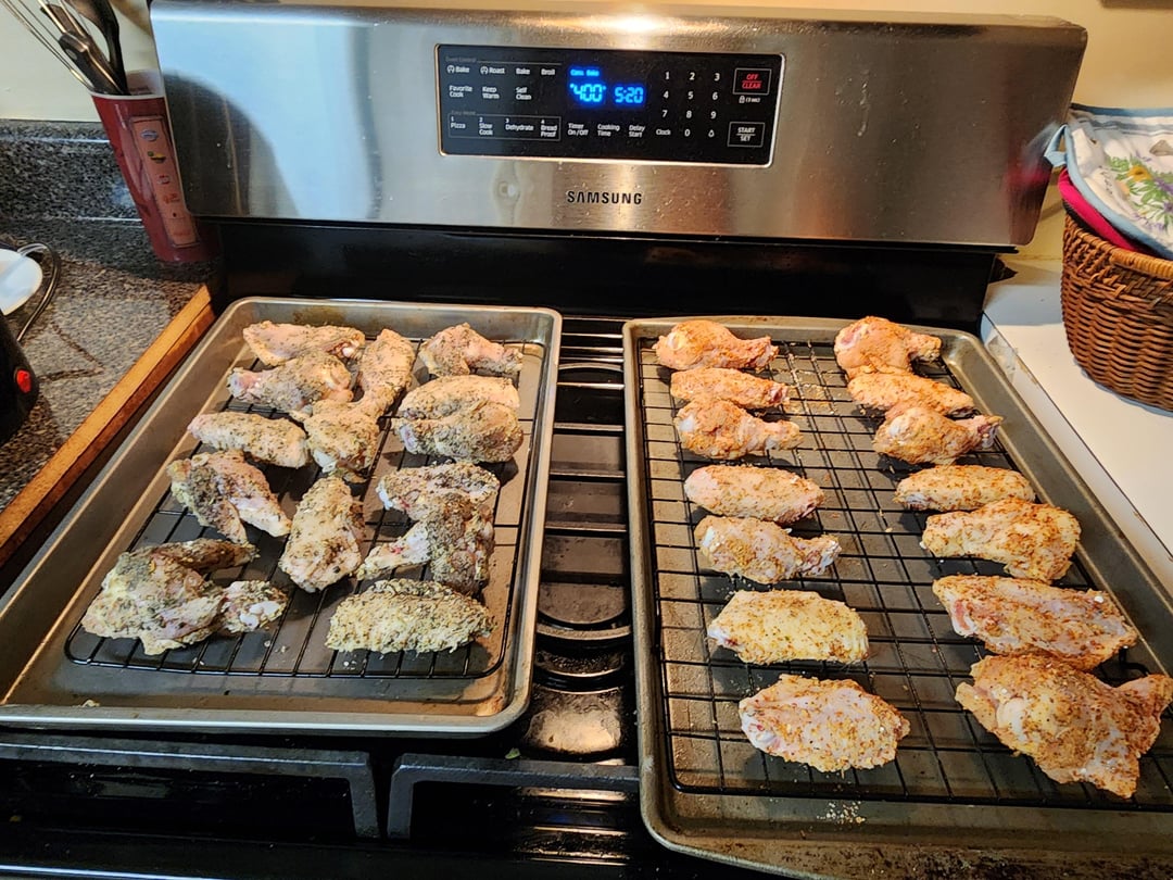 My family celebrated Christmas early, so for the actual day, my parents and I both wanted wings. I ended up giving 18 of them to my neighbors too, who loved them! These are the only wings I've ever had where I didn't end up wanting any sauce with them. Made homemade salt and pepper fries and homemade blue cheese dressing too.