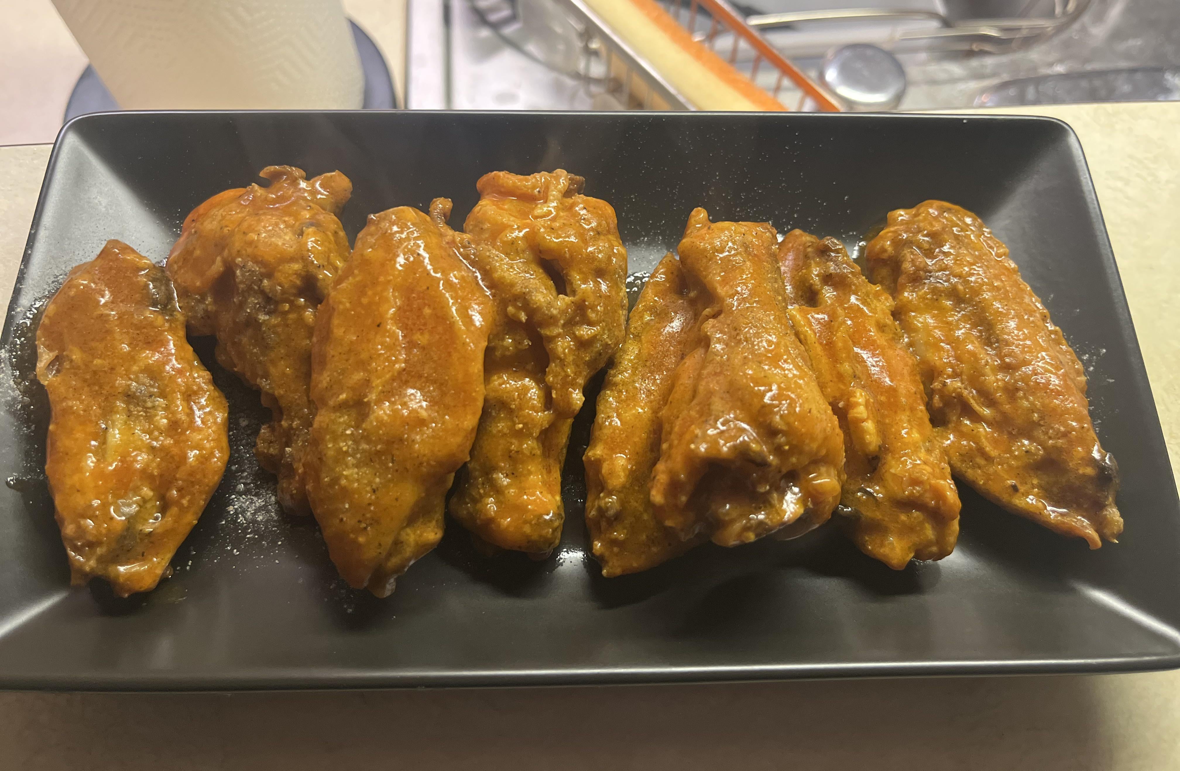 Crispy baked wings. Added some lemon pepper seasoning to the top.