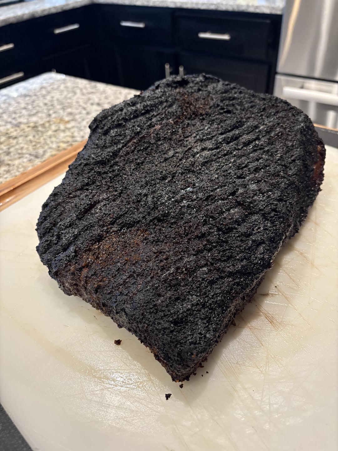 5 hour brisket on WSM. Came out delicious even dealing with fluctuating temps due to wind. 15lb full packer for those who don’t think a brisket that size can be finished in 5hrs.