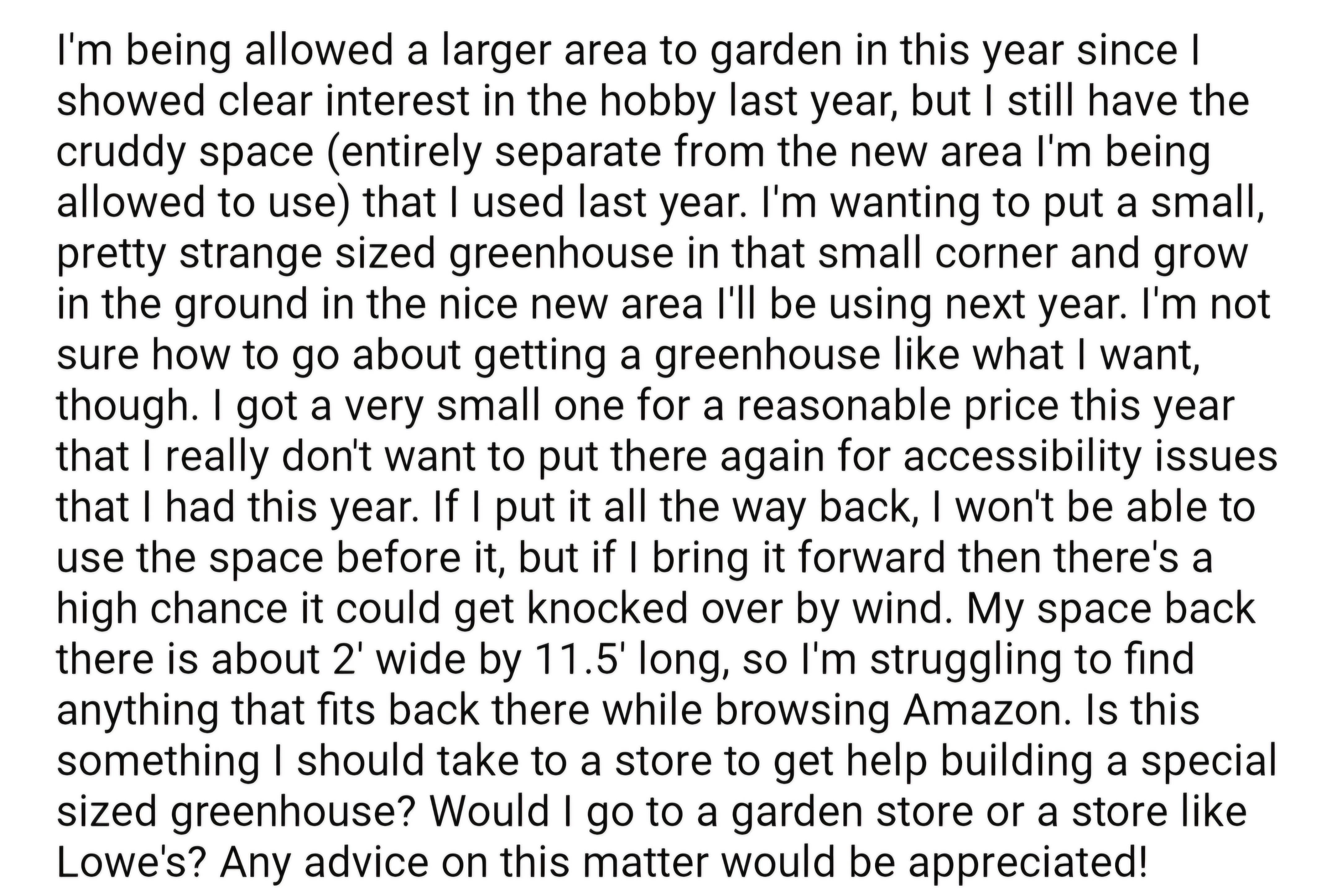 Also, for that size of space, you might look into clear poly row covers — you can get a kit for about 30 bucks that comes with the plastic & hoops. Downside to that is that they aren’t very tall.