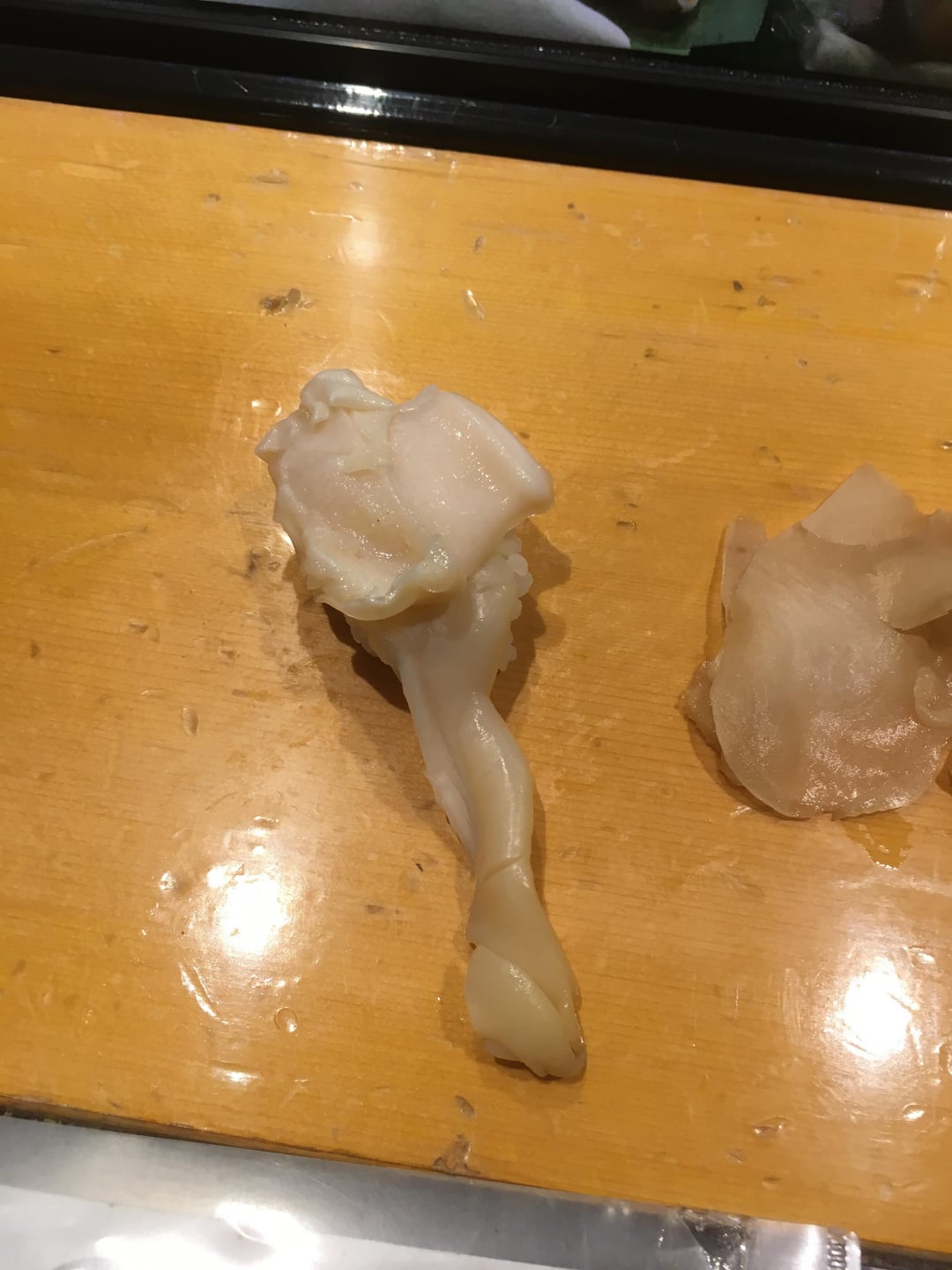 I think it’s a giant clam (mirugai). The geoduck is a member of the giant clam family.