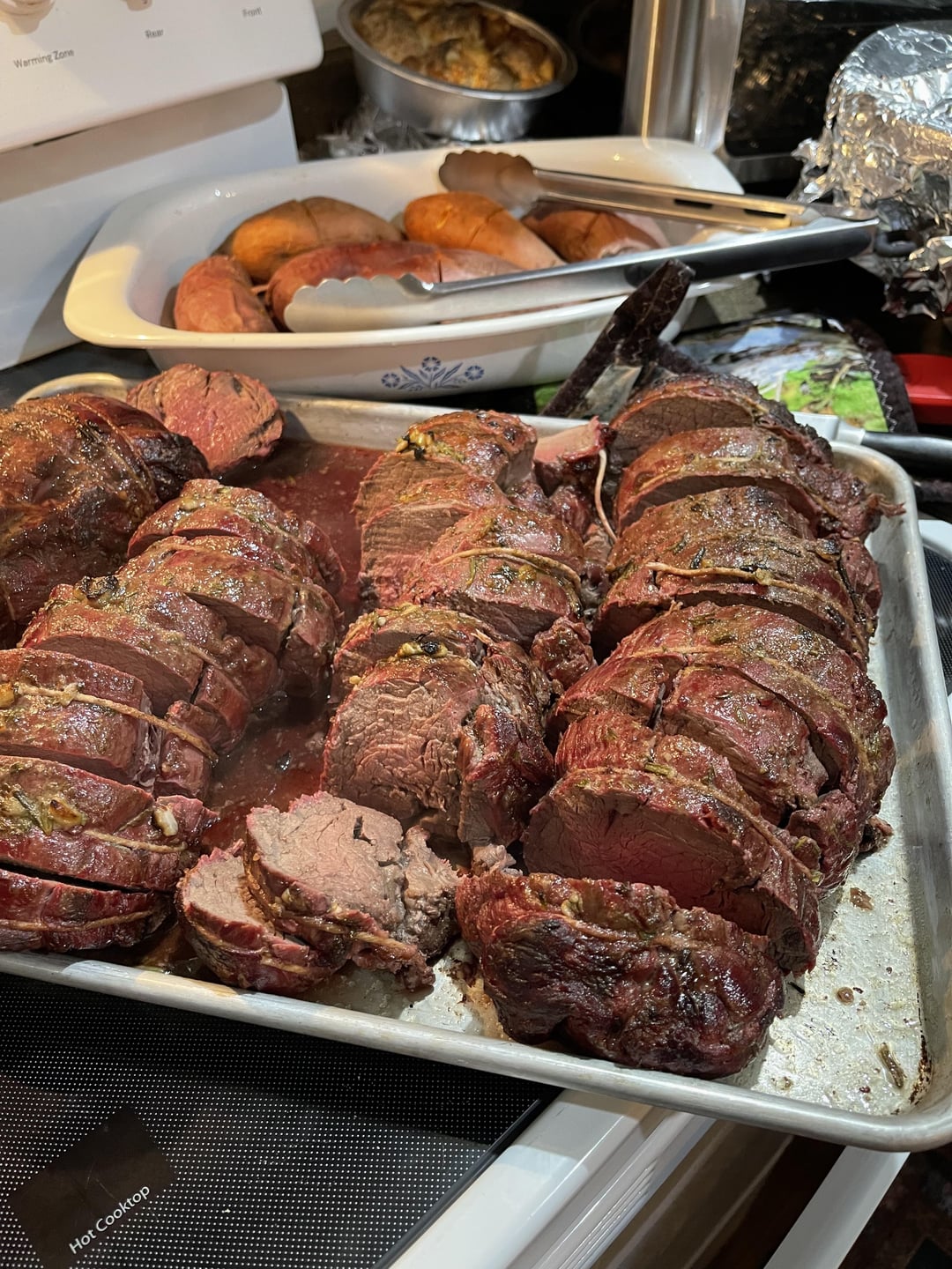 Two 8 lb wagyu tenderloins cut in half, 500 degrees for 25 minutes. Temp probe in one, took off at 122 degrees. Turned out fantastic.
