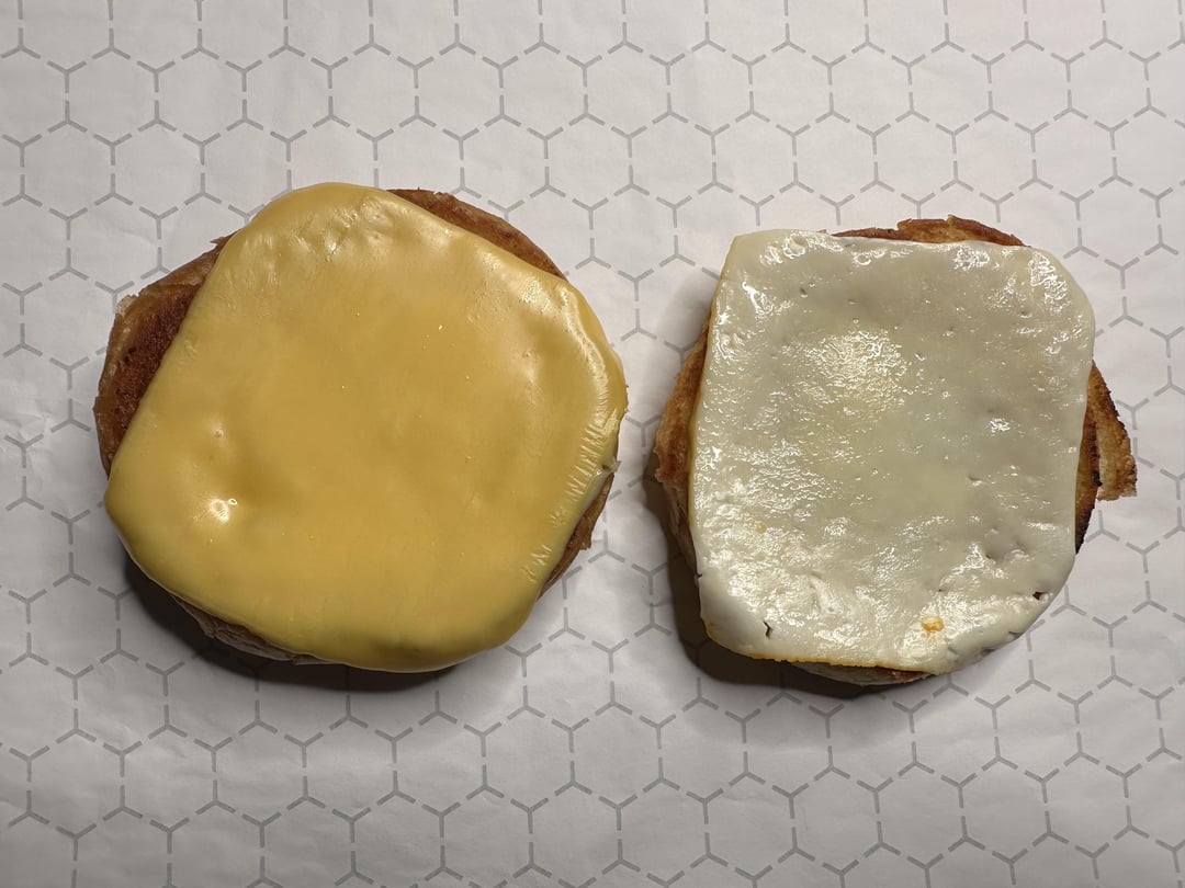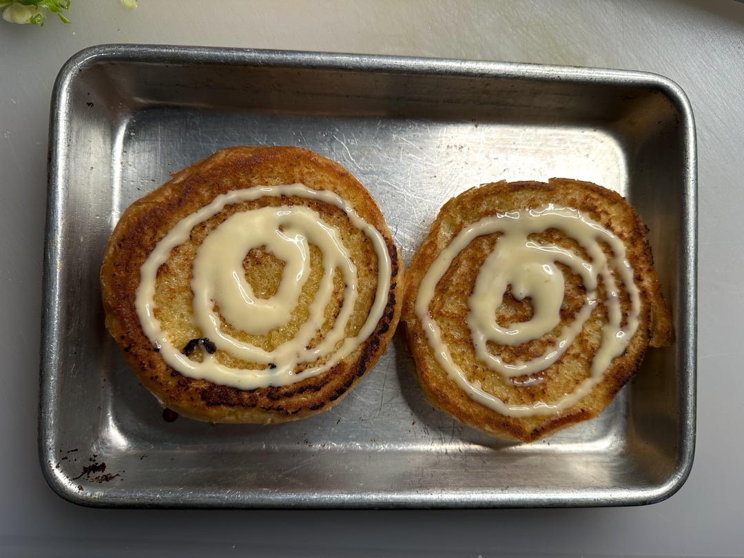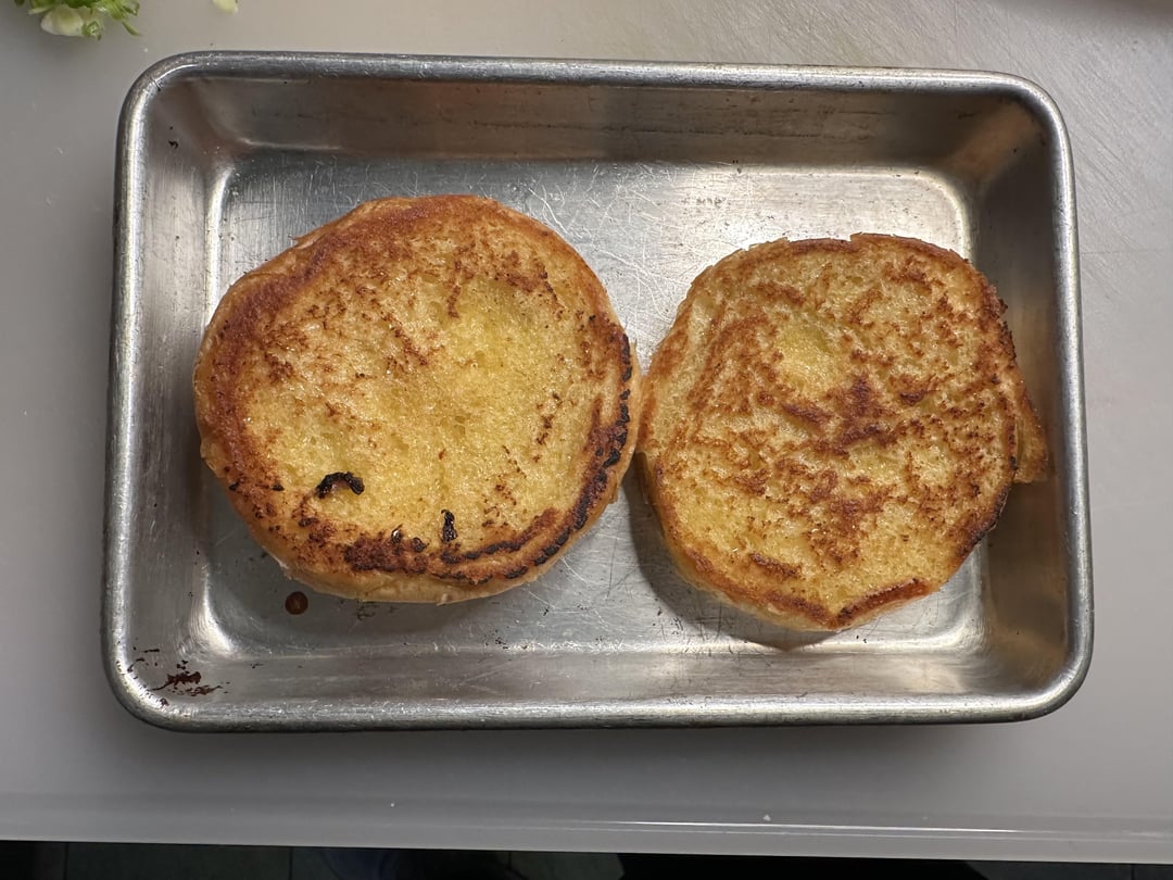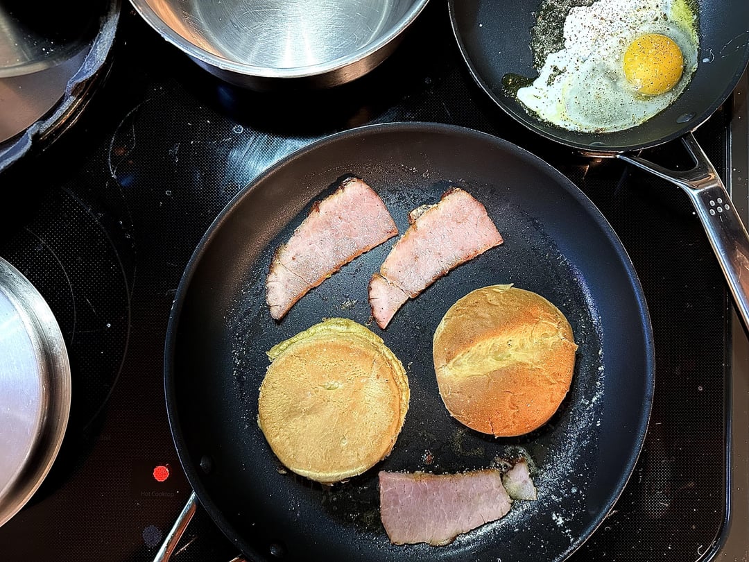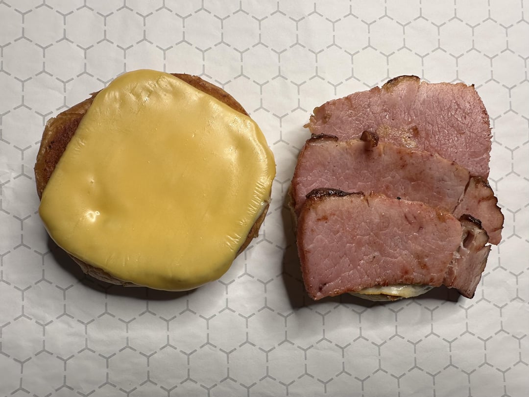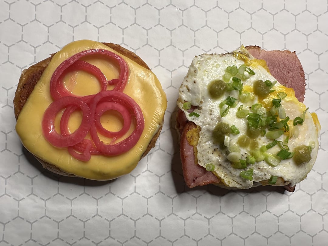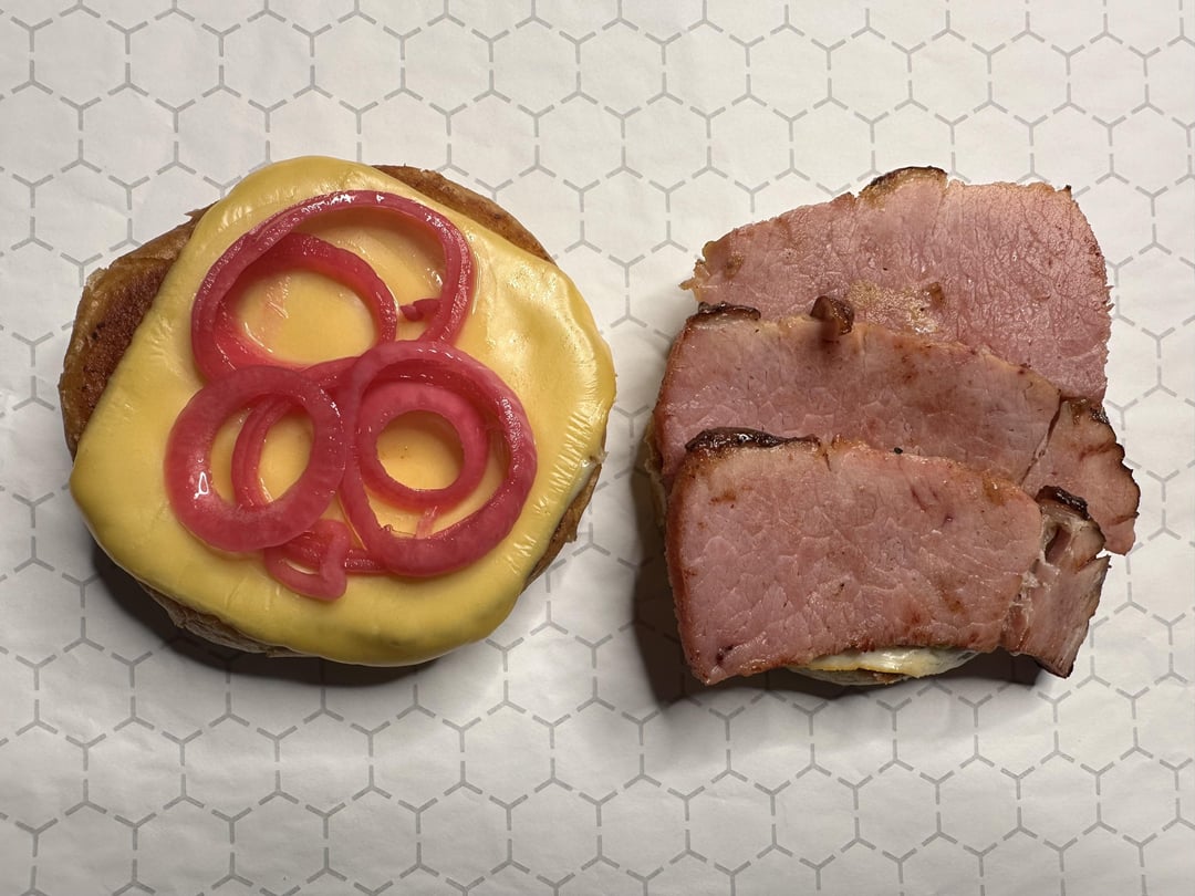 Some leftover glazed and smoked Christmas ham, an over medium egg, scallions, Muenster and American cheese, homemade maple mustard aioli, and pickled red onions on a buttered and griddled bun.