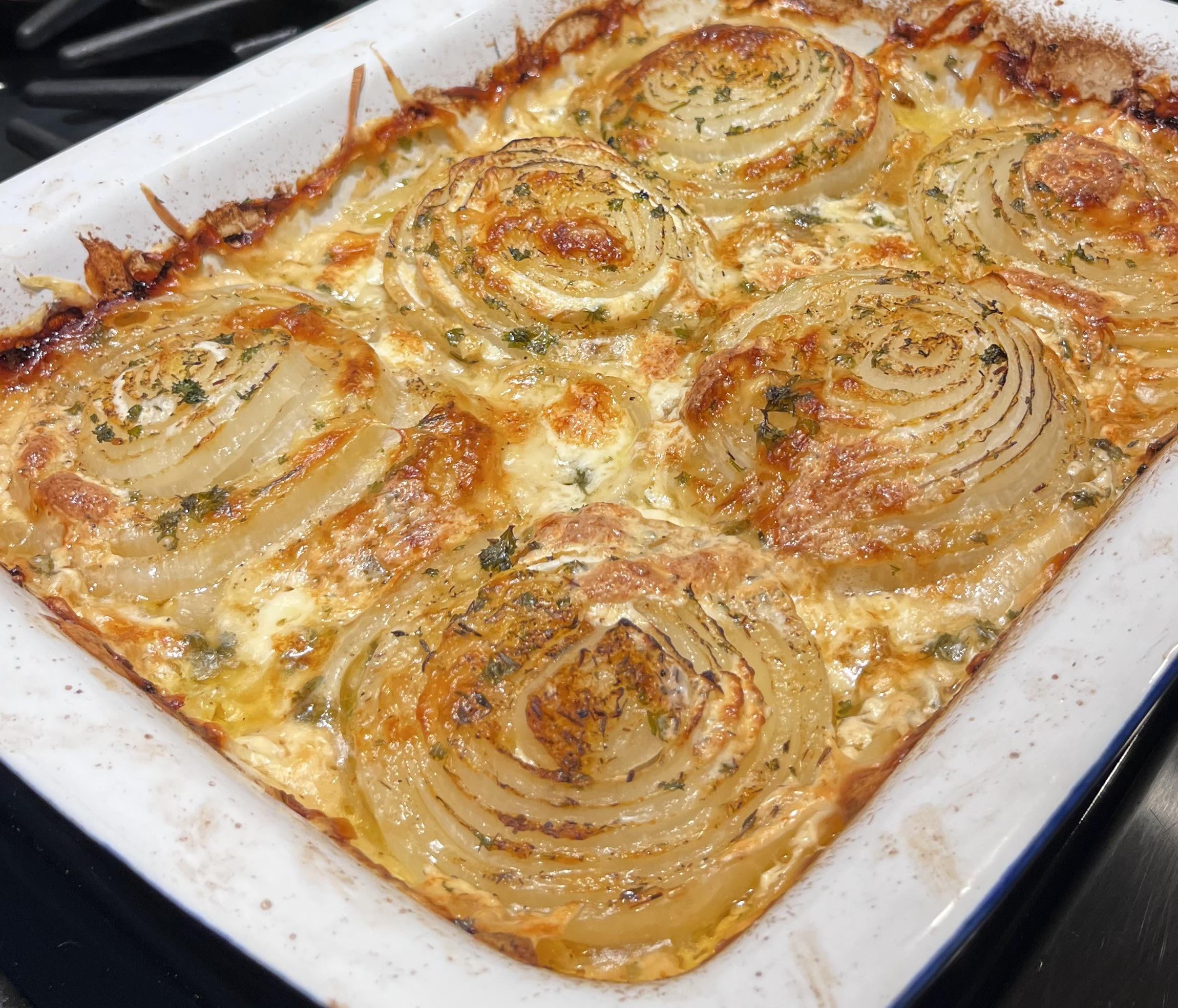 I saw a post on here with these and decided to give them a try myself. So delicious! Sweet onions layered with Comté, mozzarella, and pecorino cheeses with some thyme, parsley, paprika and chopped garlic. Dotted with butter and baked.