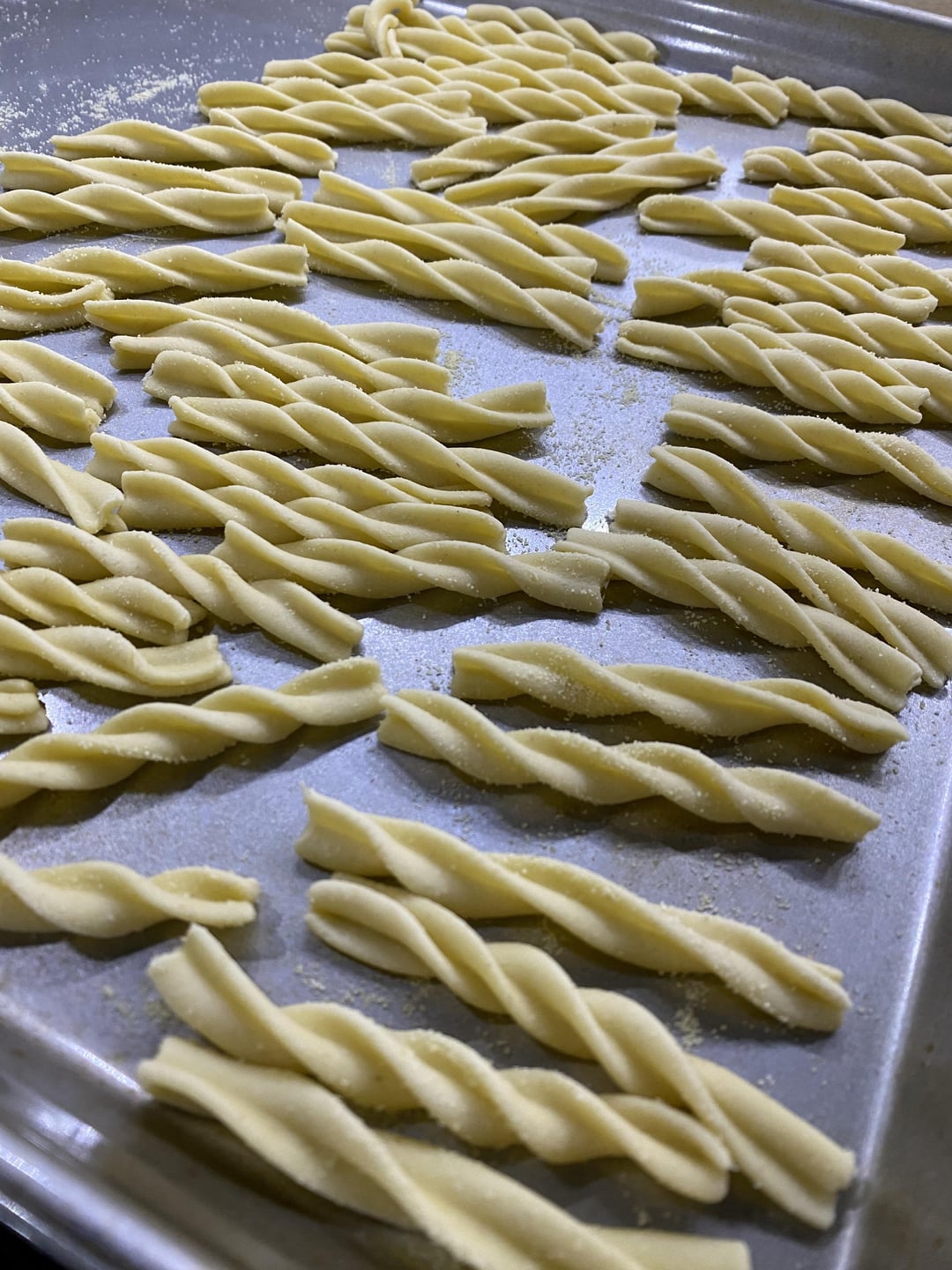 Dough: 250g semolina, 95g water. Form into stiff crumbly dough, kneed on counter roughly 10 minutes then wrap in plastic wrap and rest in fridge +30 minutes. Section dough into walnut sized bits and pass through press (mostly at speed 2 until the length of index finger). Pause to cut. Lightly dust with semolina and twist ends in opposite directions to enforce the coil shape. Let dry in single layer. Boil in salted water 3 minutes. Drain, reserving some starchy pasta water.