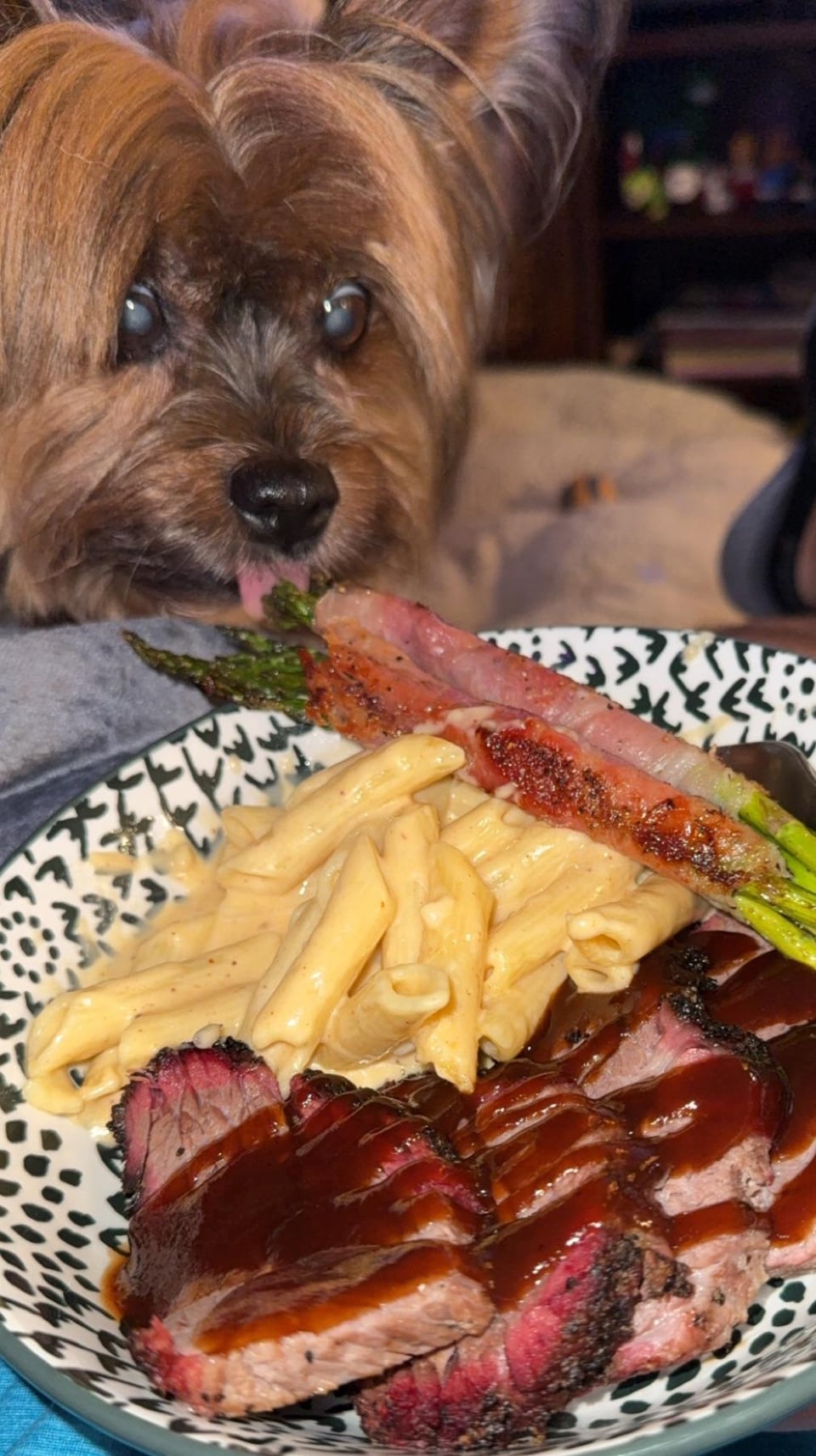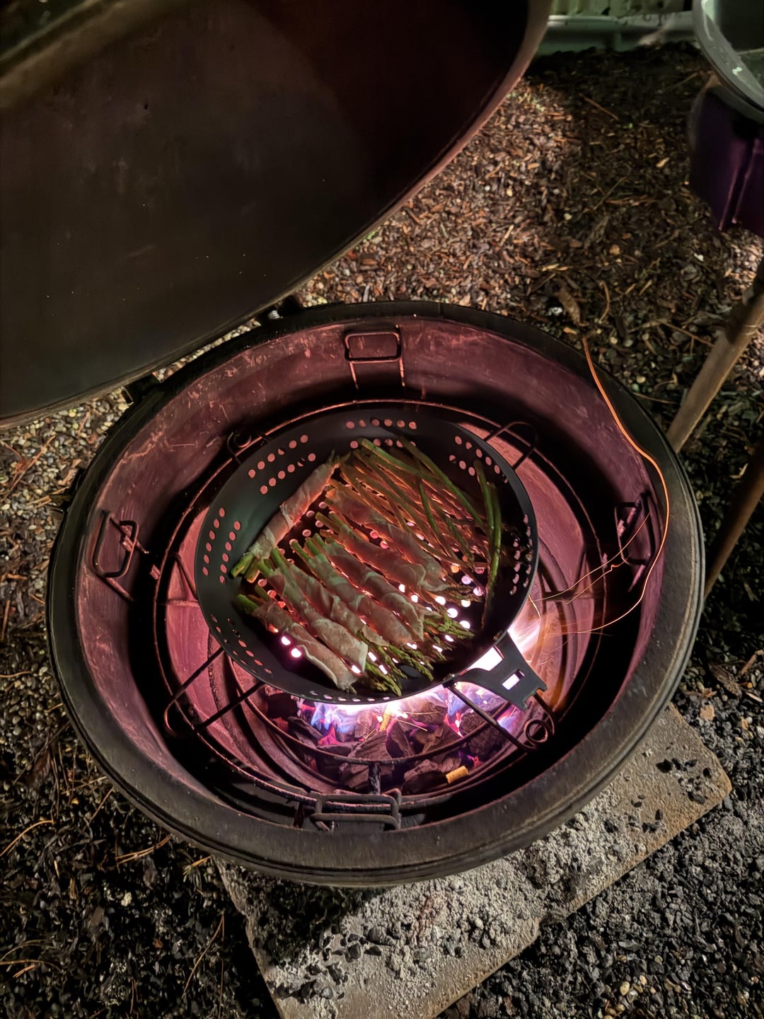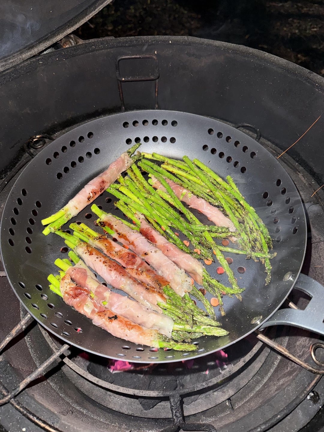 I got this Oxo carbon steel grill pan for Christmas, it’s rad! The handle is removable so you can close the grill lid and then clip it back in to remove from the pit. I had a few pieces to my grill grate set up and this one ring piece with 4 kind of arms that go out to support it that I never understood the use for, but it works perfectly to sit the pan right above the fire. Maybe that’s what it was meant for. Got the fire really ripping and did some simple spg prosciutto wrapped asparagus (and some just asparagus by itself because holy shit prosciutto is expensive lol). Went great with some Beechers Mac and Cheese and left over brisket I had sealed up and in the freezer.
