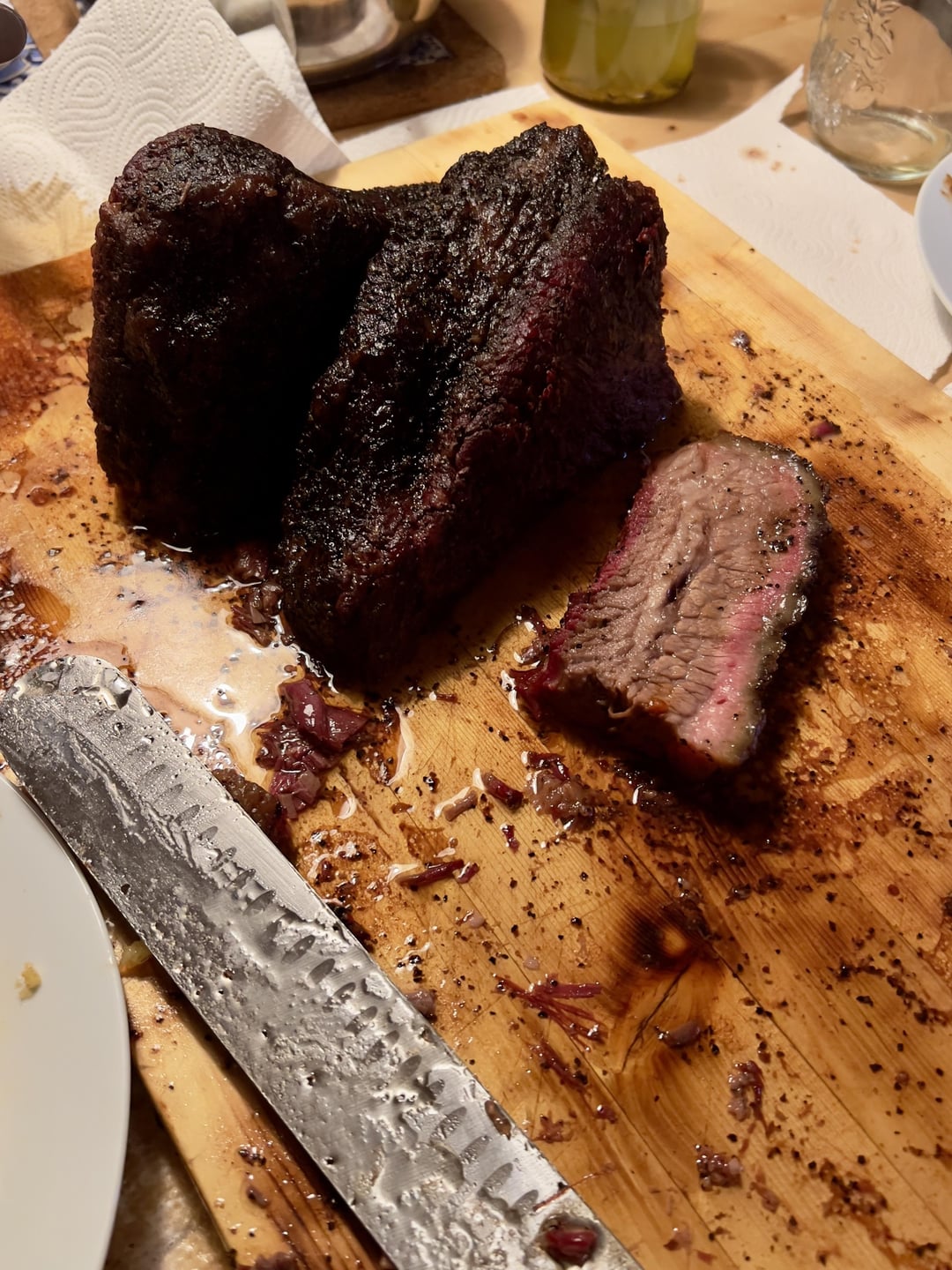 First pic is just after boating. Second is the next day, post-serve. Got too excited during the cut and forgot to take a pic of all the beautiful slices, but there’s half a slice of point there to drool at. This was brisket no 4 and def the best yet.