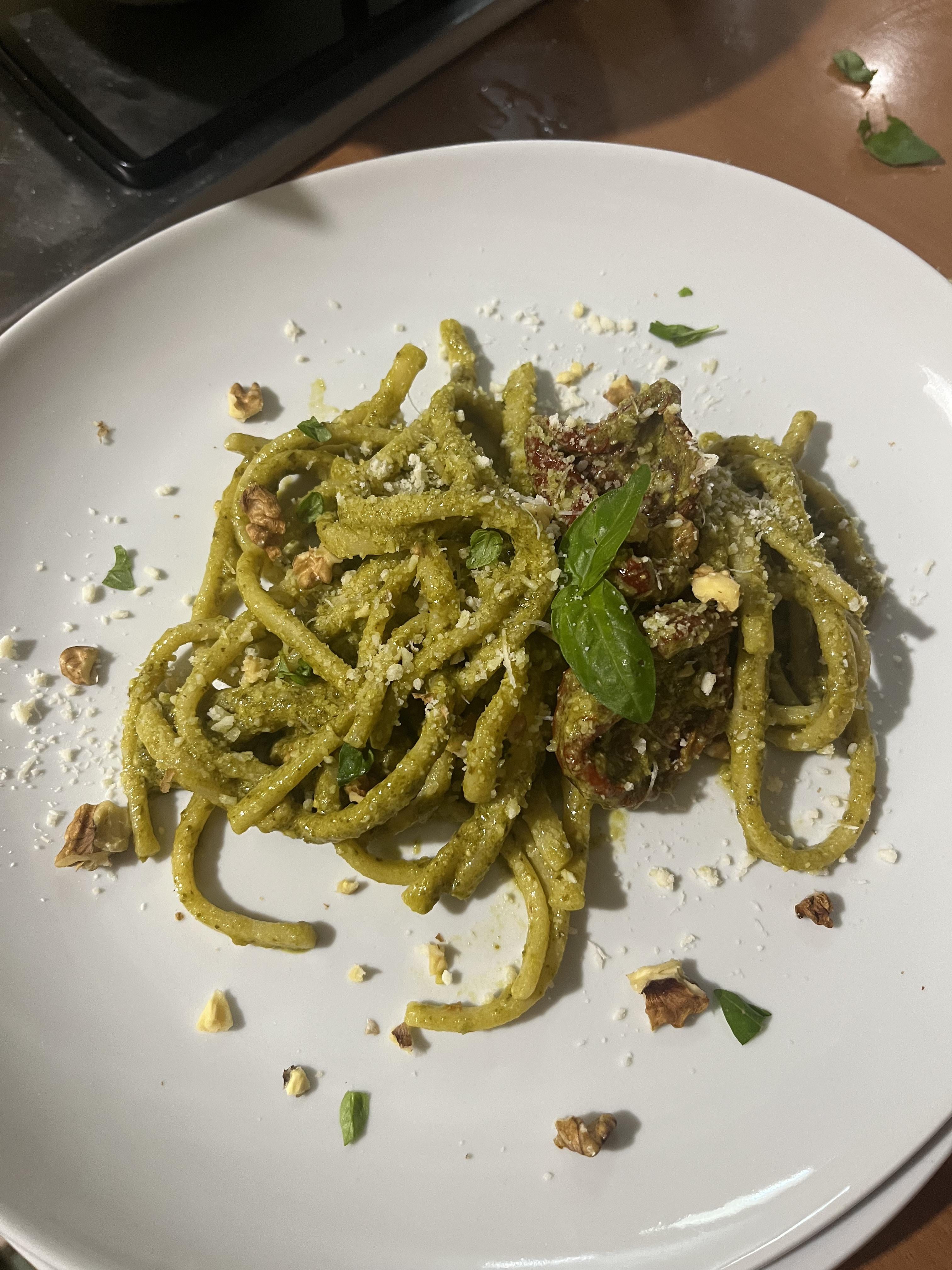Make classic pesto, add nuts, some more fresh basil, parmigiano and dried tomatoes