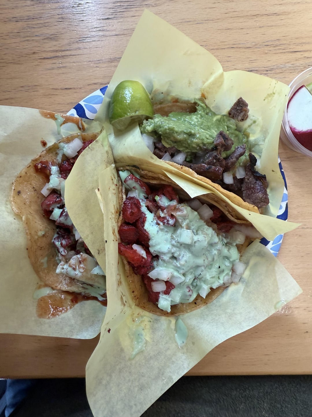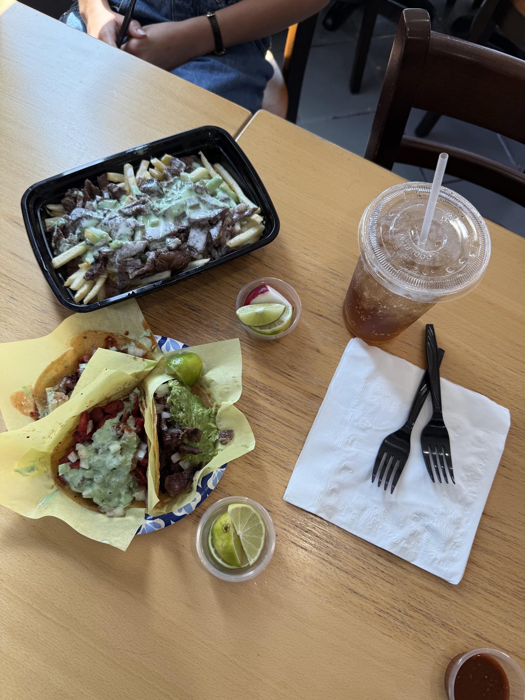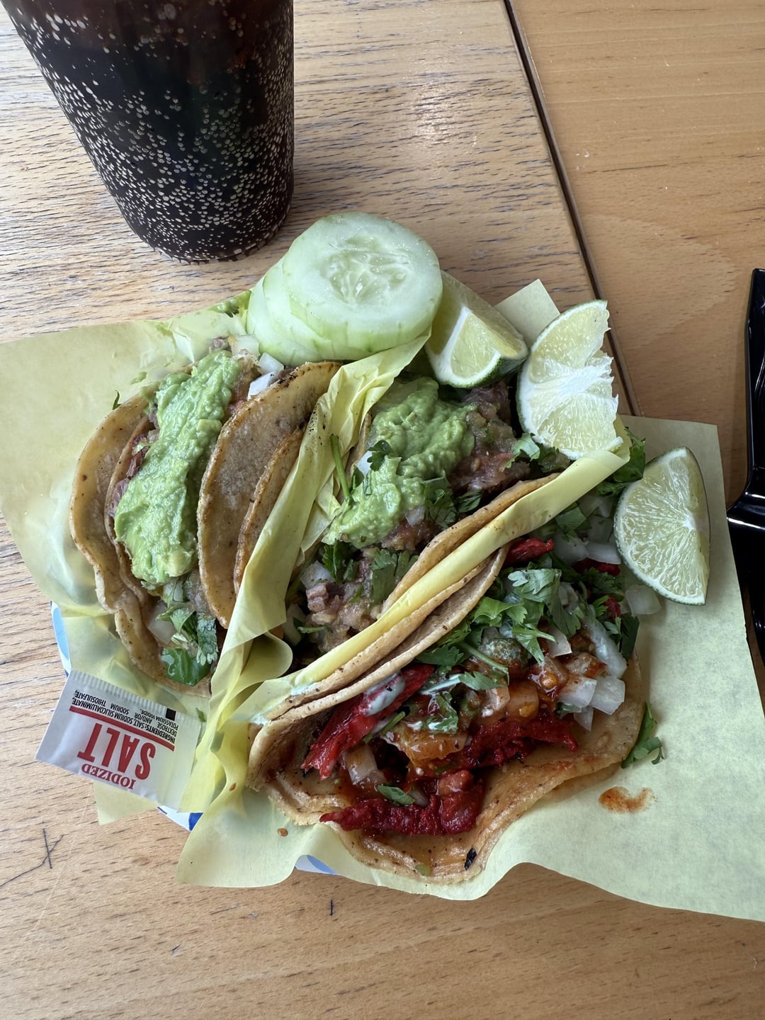Once you put your order, matter fact head over to that condiment bar and you’ll see a variety of self serve options like cucumbers, radishes, lemons, and three different types of salsas. There’s also ziplocks, salsa cups, napkins, cutlery and salt so you really have it all to make the experience as authentic to some Tijuana tacos as possible, while still giving States vibes yk. The tables are vast and always clean, and if you get the combo you’ll also get a drink for which they have agua fresca options (premade Horchara and Jamaica) or fountain machine options (Pepsi, Pepsi Zero, Manzanita Sol, Dr P, Lemonade, Starry). I personally recommend Manzanita flavor, although they also have glass bottles and other bottled drinks if taps make you guys uncomfy.