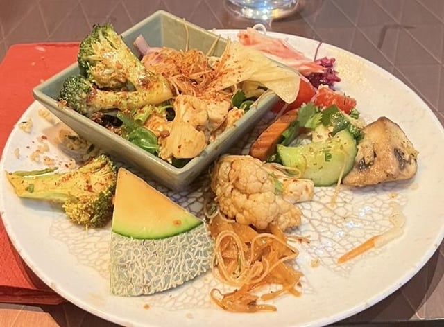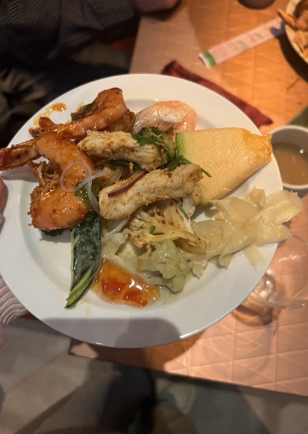 There is a lot going on here lol it’s hard to say since determining what some items are in this photo is hard, plus there is probably a lot of oil involved with the noodles and what looks like wok fried veggies, sauces for the meat and seafood. Is this 3 plates worth? I would whack 1250 on it maybe a little more. But also I wouldn’t try to track at a buffet.