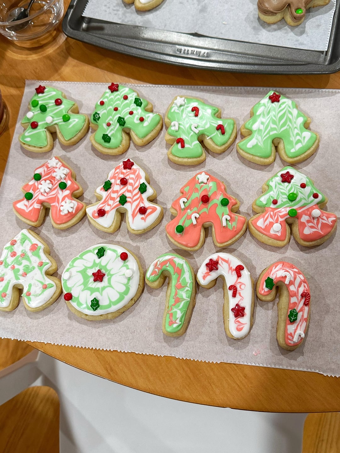 I guess I just needed to add water to my royal icing the first. But, aside from the red looking pink, so much improvement! So excited to keep practicing.