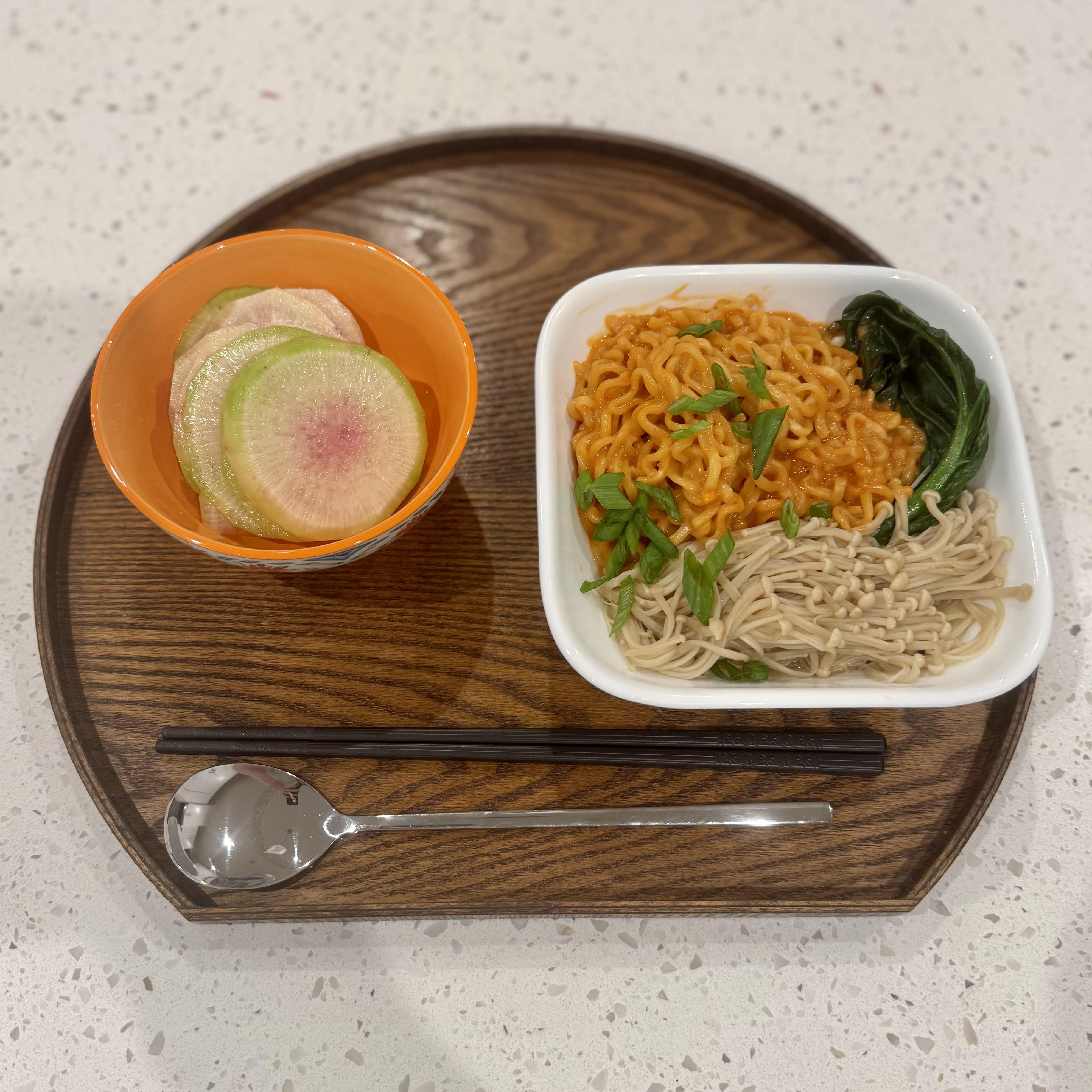 I had extra enoki mushrooms that I needed to get rid of so I blanched them with the greens in a little salted water while the ramyun was cooking.