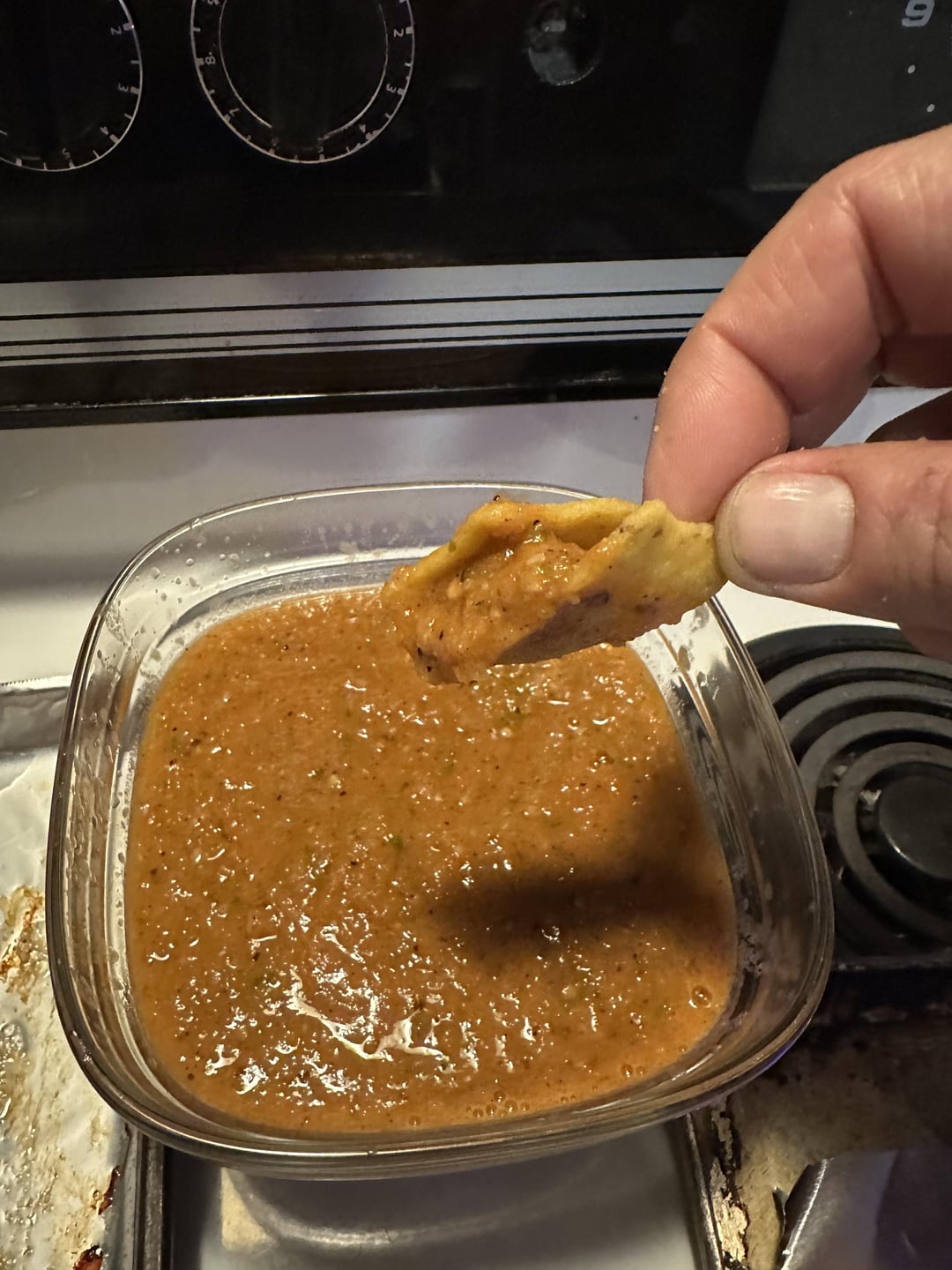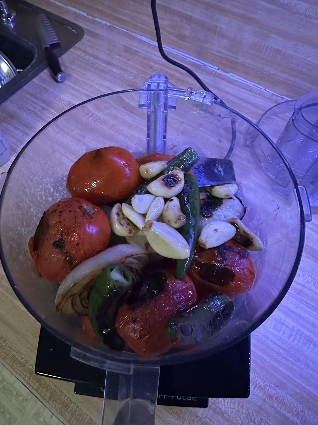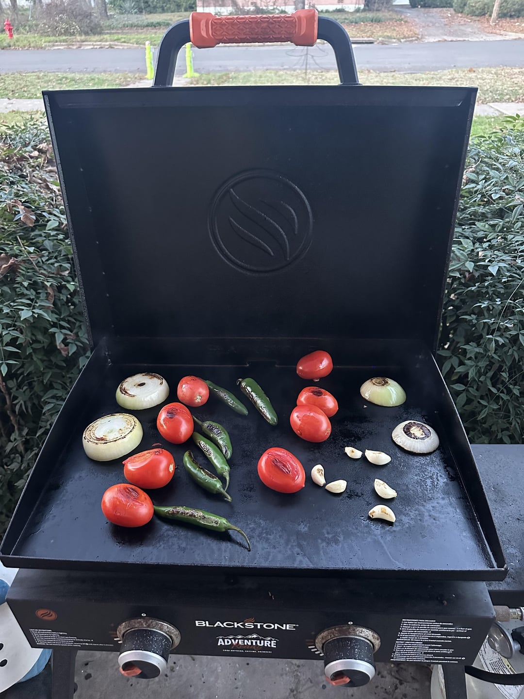 8 Roma tomatoes, 1 large white onion, 4 Serranos, 2 jalapeño’s, 1 whole head of garlic half cooked on the griddle, half raw. 2 tablespoons of olive oil. Not pictured 😐 1 handful of cilantro, juice of half a large lime. 1/2 teaspoon of msg, salt and pepper to taste. All blended in the food processor. Nice heat on the backend but nothing crazy. I can’t stop eating it.