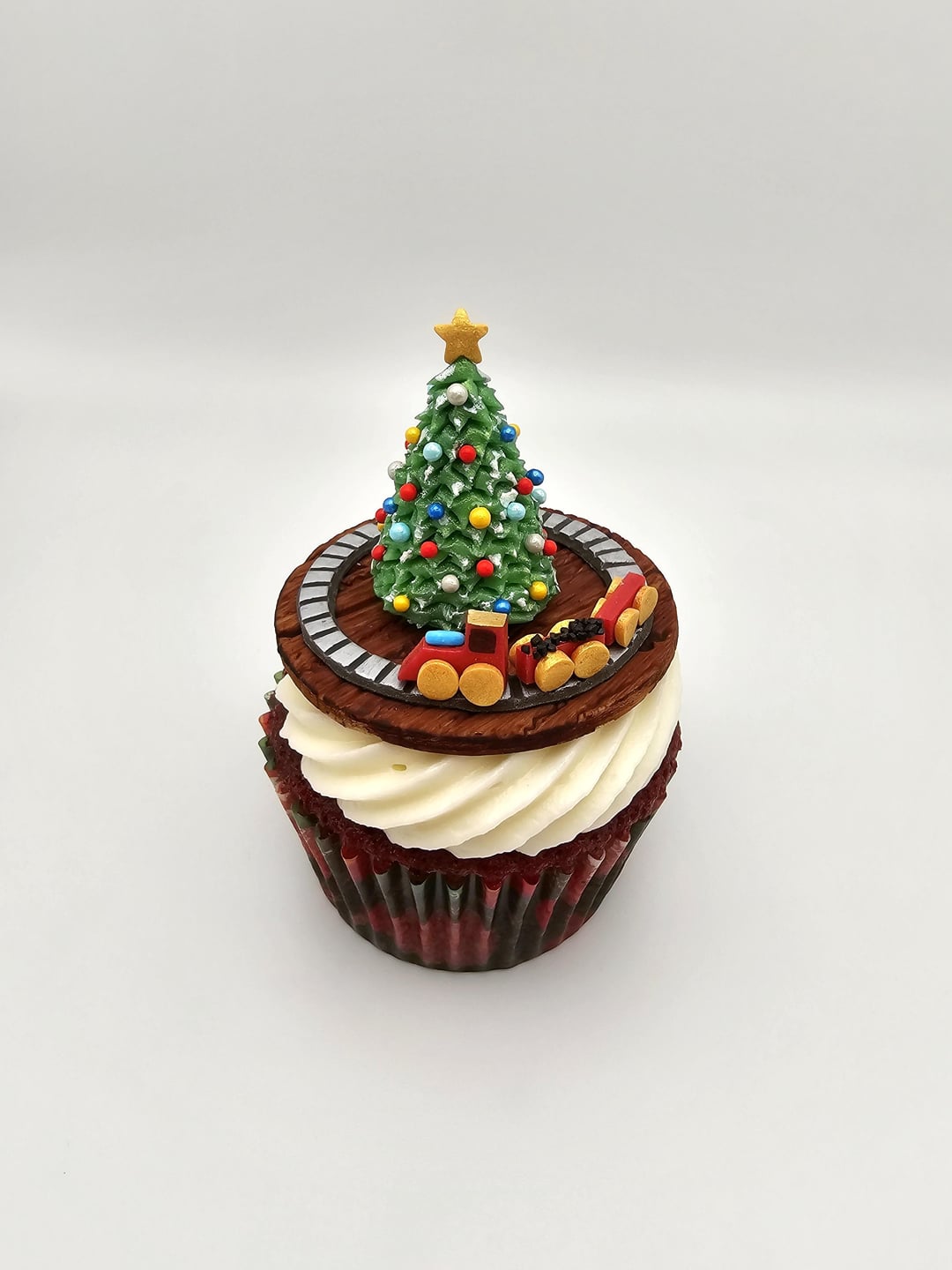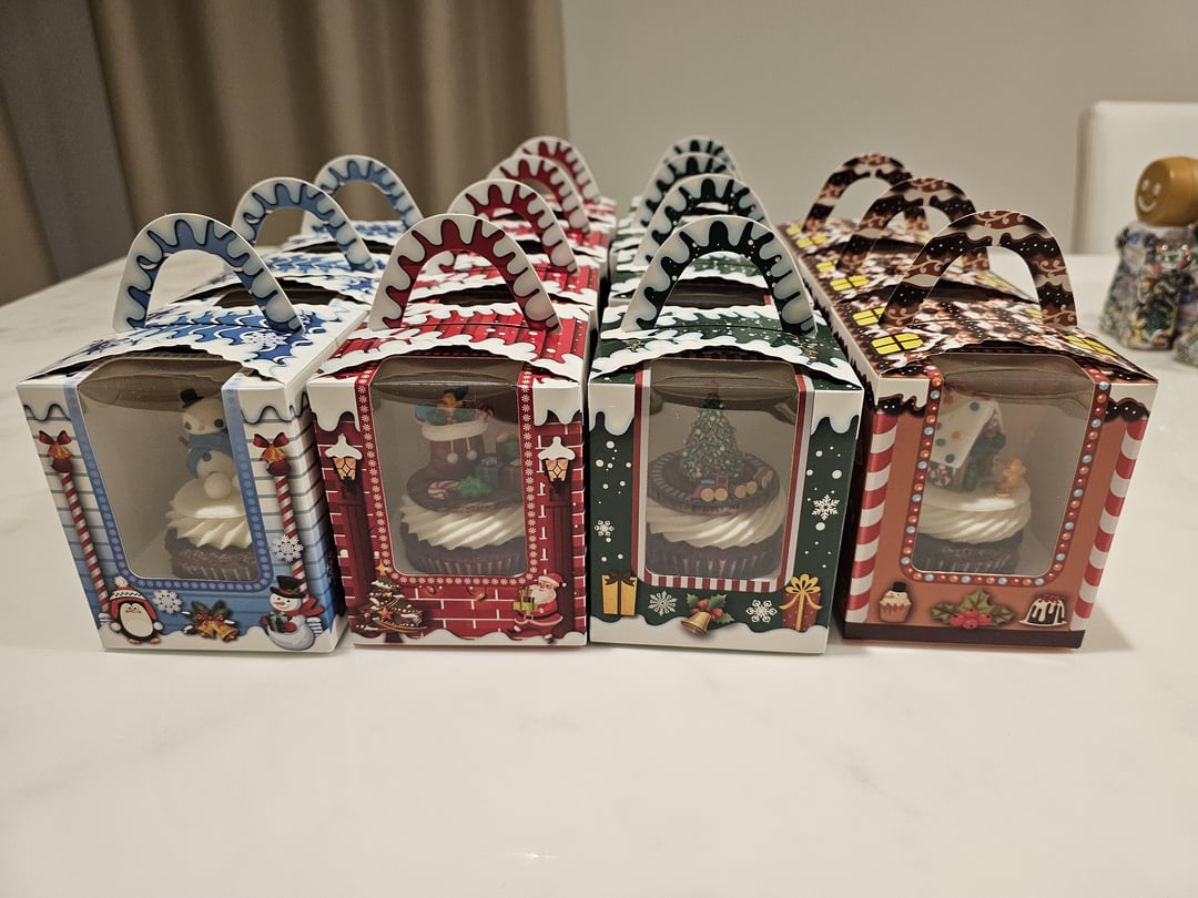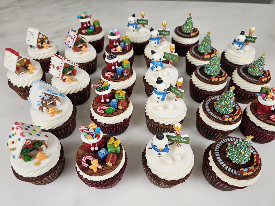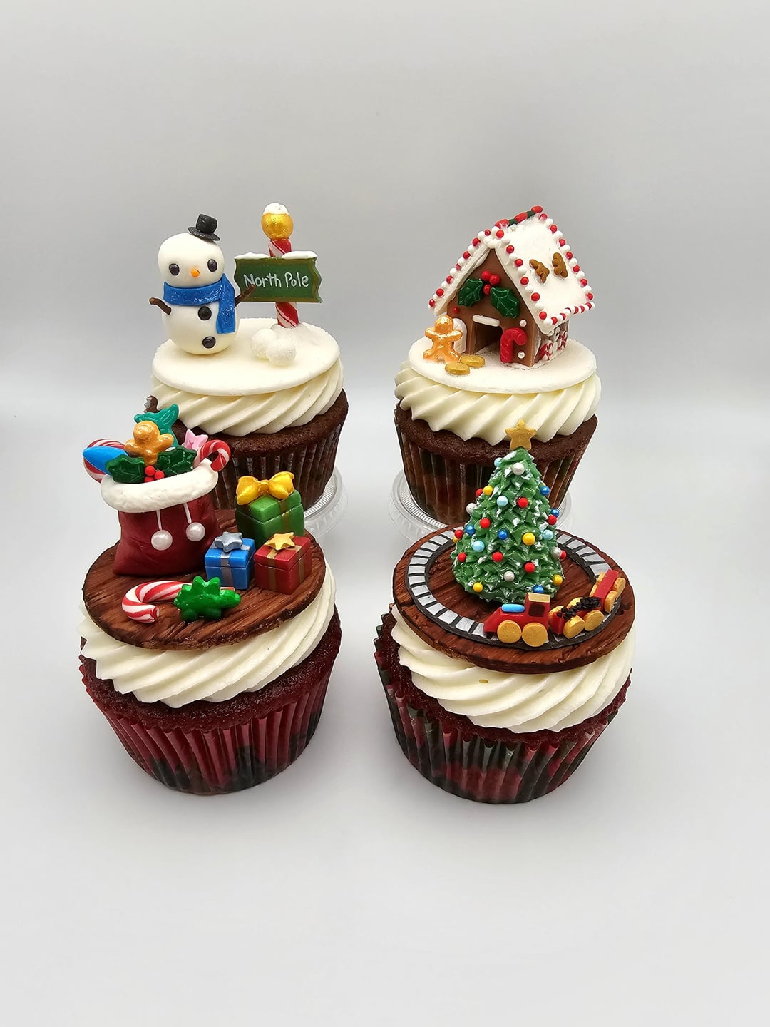 I made these to pass to family and friends for Christmas. Everything is made from scratch, including the modeling chocolate toppers. Everything is edible. The flavors are red velvet and gingerbread with cream cheese frosting 🤤.