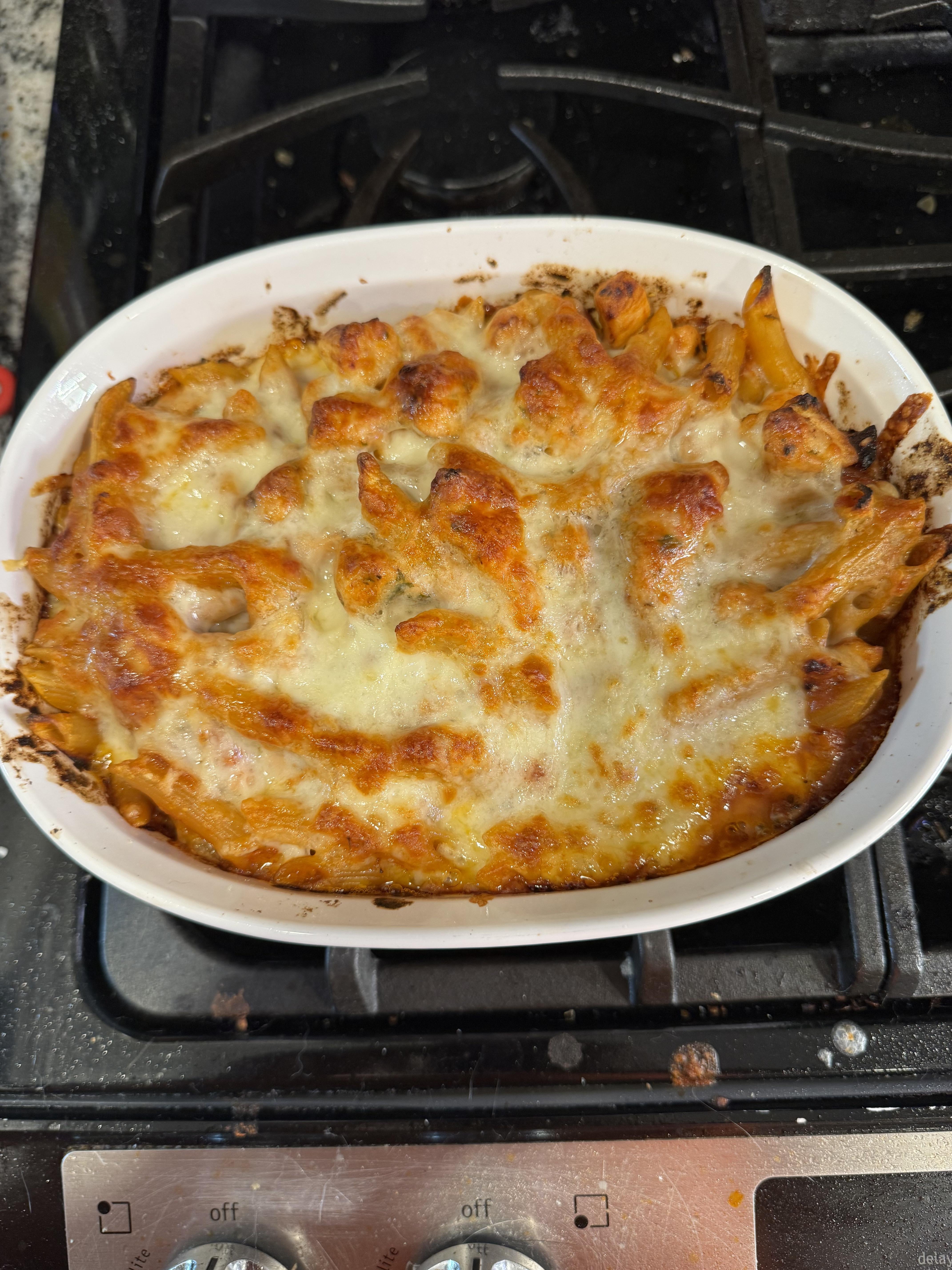 Sweet San Marzano sauce with garlic, caramelized onions, sugar, salt, parsley and other seasoning. The chicken was cut into 1/2 inch pieces and sautéed in Olive Oil with seasonings and then finished with garlic and butter. The chicken was removed from the pan, cooked sauce added with some heavy cream and freshly grated Parmesan, then I added the pasta and chicken back to the sauce, got everything evenly coated and baked it with some Grande Mozzarella and Provolone mix until golden brown.