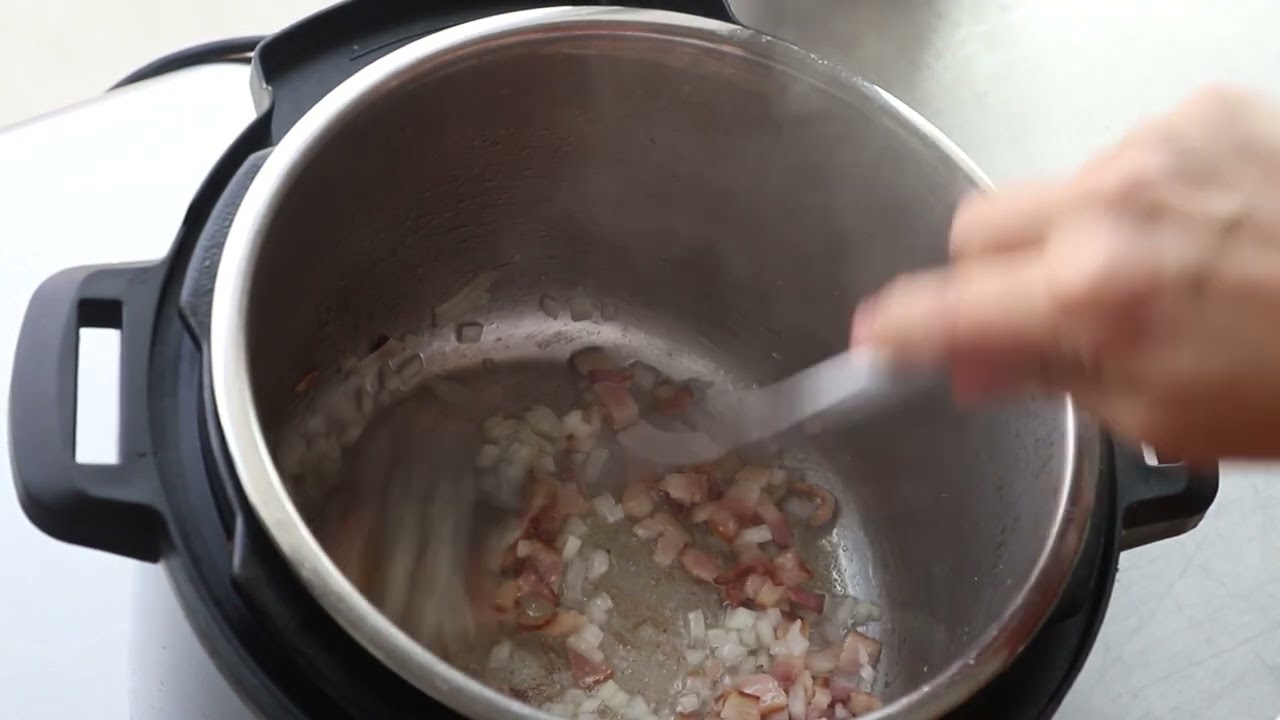 Add onions to the cooker and saute for about 3-5 minutes. At the end of the time, add in your garlic. Saute the garlic for about a minute.