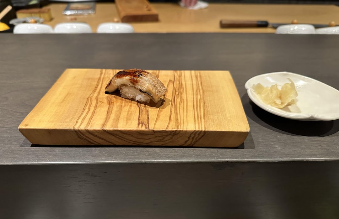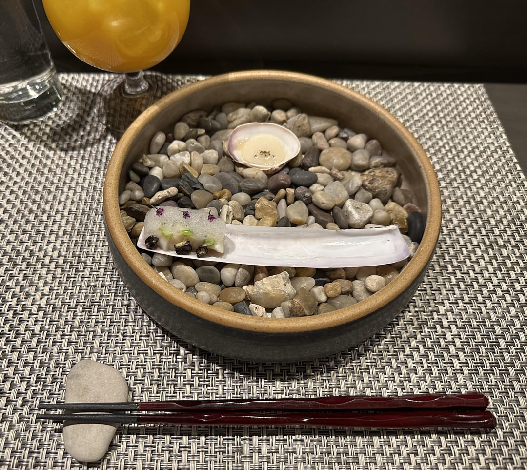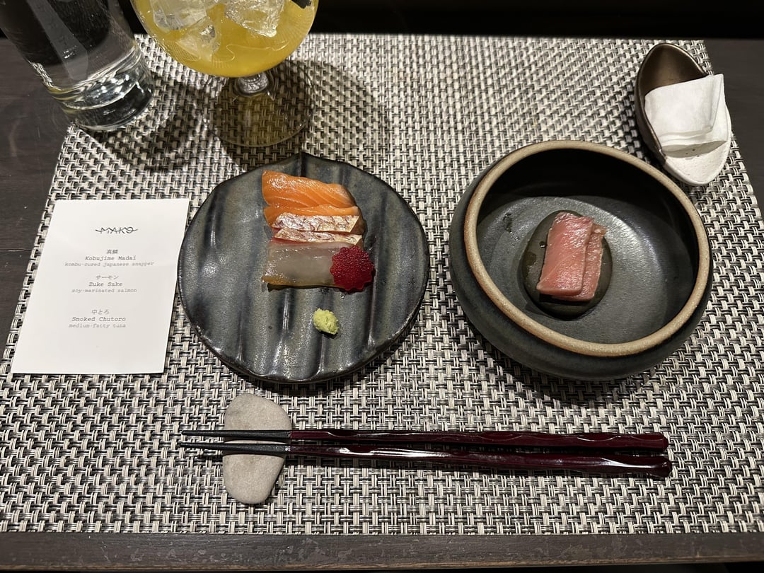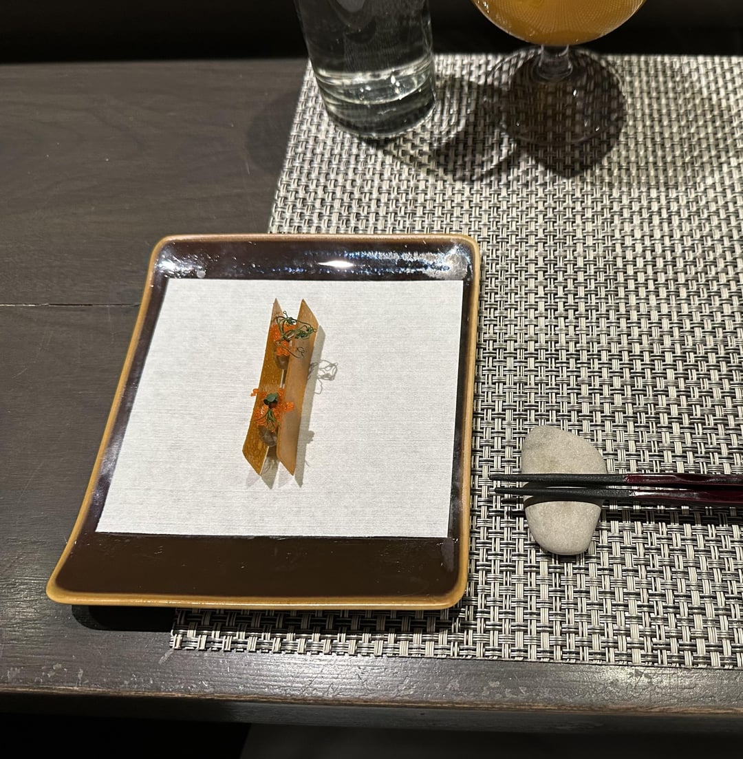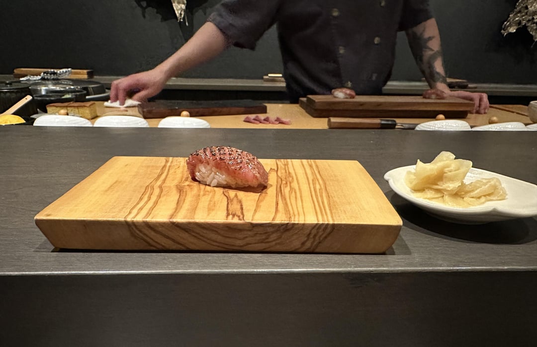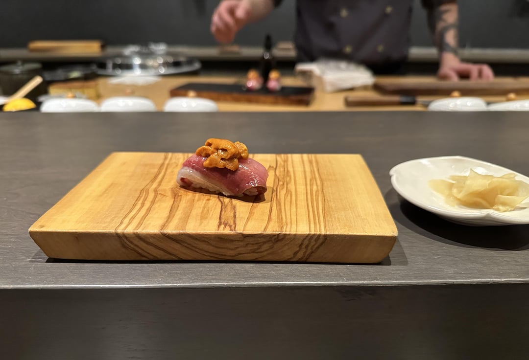 Ambiance – 7.5. I completely overlooked the subtle sign at the entrance and ended up circling the entire block haha. Don't be like me. Once I eventually made it inside, I was greeted and escorted to my seat at the sushi counter. The restaurant requests that you arrive early, but I'm not sure why since service didn't begin promptly at the scheduled time anyway. I found the decor interesting, everything was clean and comfortable, and the chopsticks were perfect. The atmosphere was relaxed and quite social, with guests chatting amongst themselves and with the chefs. I did have a bit of trouble hearing the staff describe the dishes at times due to background noise. The main reason this score isn't higher is because of the smell – when I walked in, I immediately smelled fish, which made me very apprehensive. Fortunately, all of the seafood I was served was fresh, but the scent persisted throughout the meal.