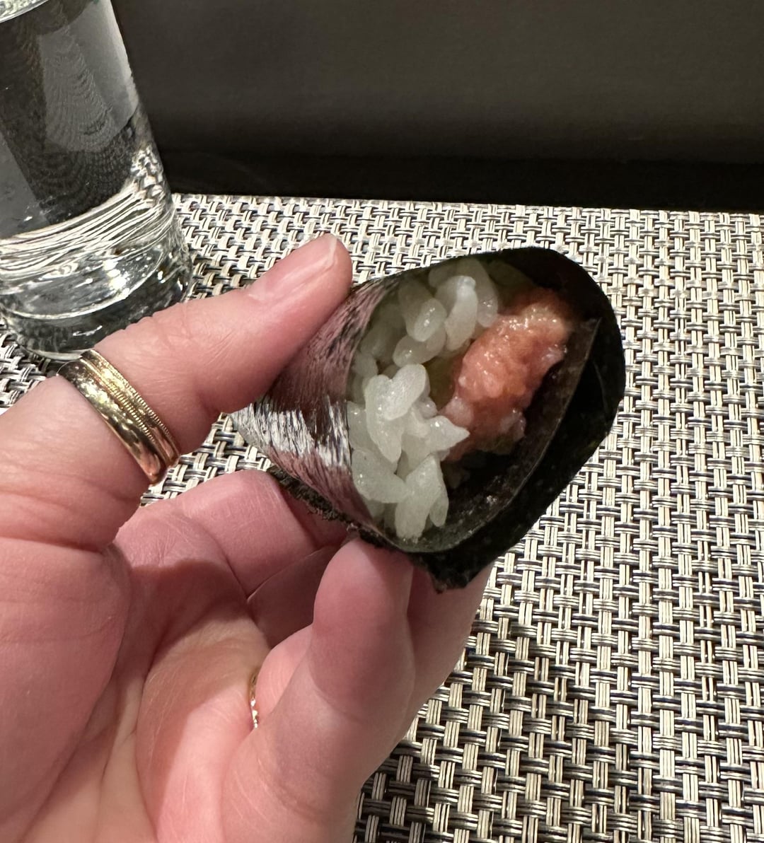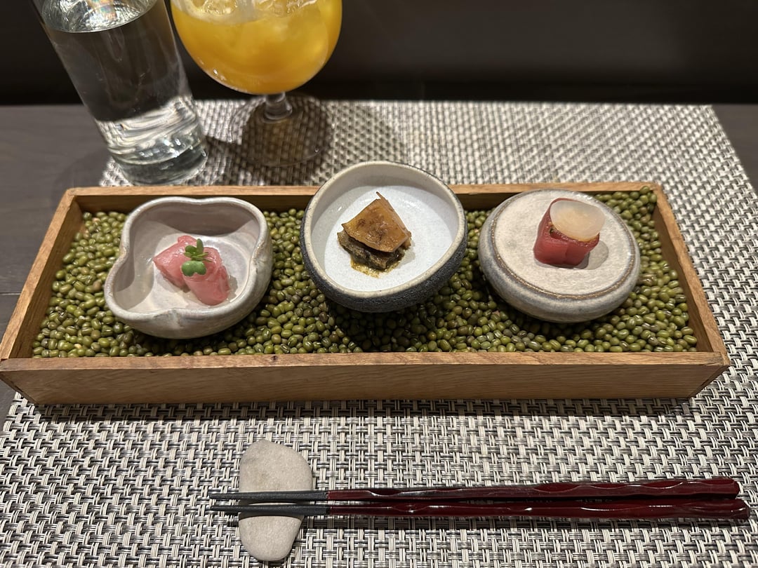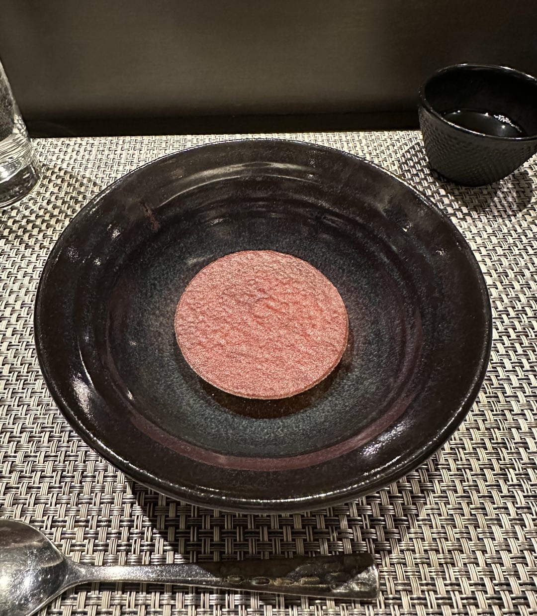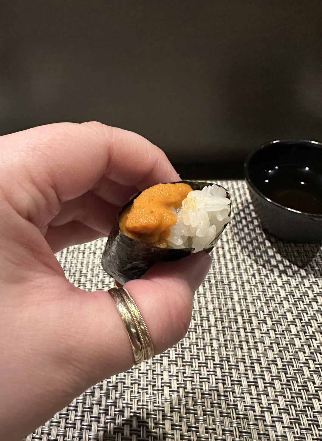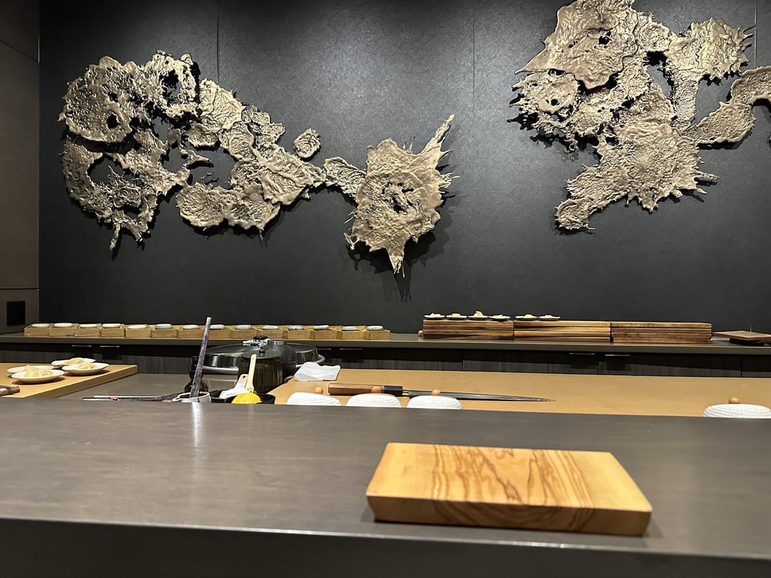 Ambiance – 7.5. I completely overlooked the subtle sign at the entrance and ended up circling the entire block haha. Don't be like me. Once I eventually made it inside, I was greeted and escorted to my seat at the sushi counter. The restaurant requests that you arrive early, but I'm not sure why since service didn't begin promptly at the scheduled time anyway. I found the decor interesting, everything was clean and comfortable, and the chopsticks were perfect. The atmosphere was relaxed and quite social, with guests chatting amongst themselves and with the chefs. I did have a bit of trouble hearing the staff describe the dishes at times due to background noise. The main reason this score isn't higher is because of the smell – when I walked in, I immediately smelled fish, which made me very apprehensive. Fortunately, all of the seafood I was served was fresh, but the scent persisted throughout the meal.