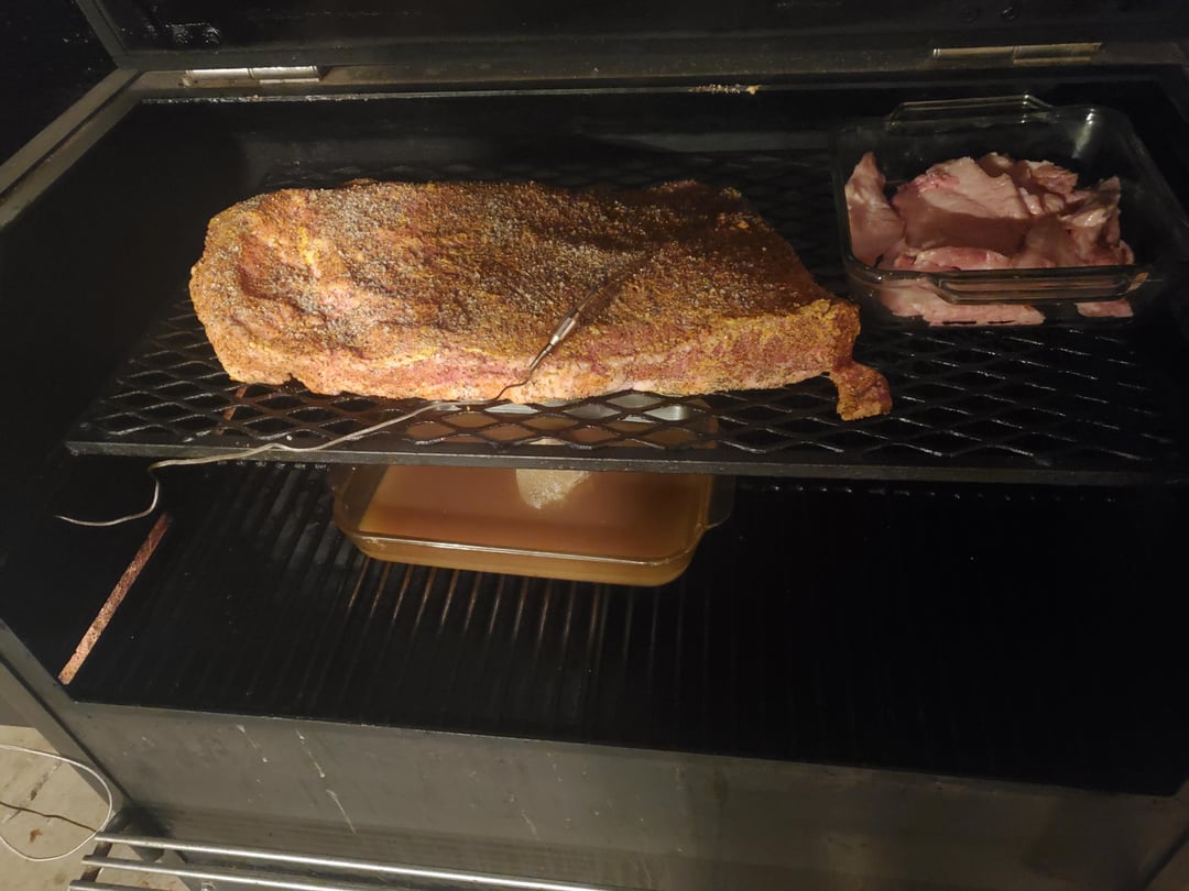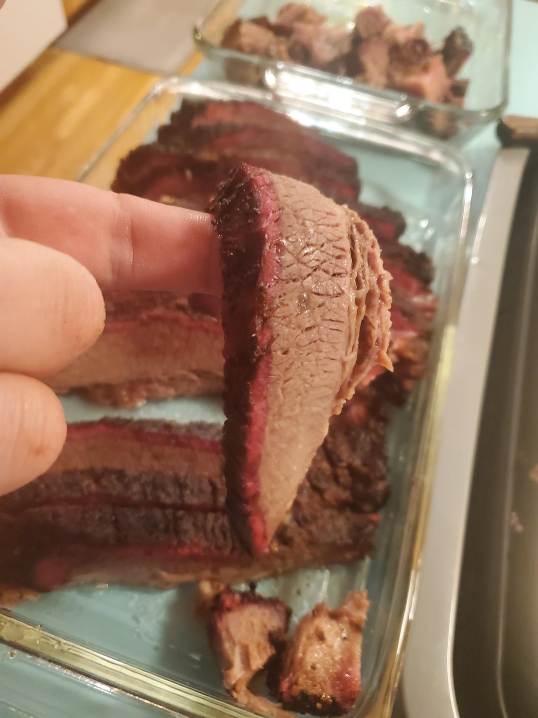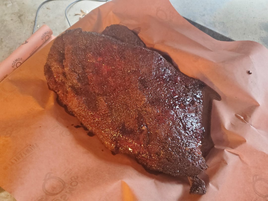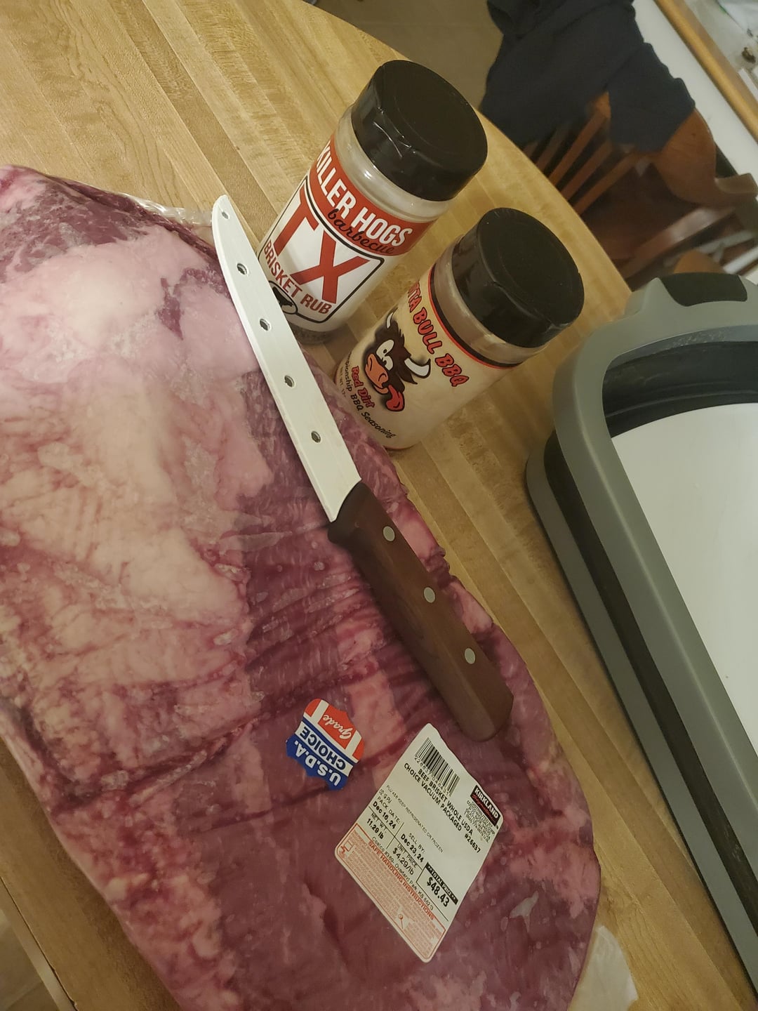 11.29 lb USDA Choice from Costco with a mustard binder, "Lott Bull" red dirt, and my own coarse SPG. Went on the Yoder with a pan of beef broth and fat trimmings (to make beef tallow), and wrapped in butcher paper with the tallow. Complete after about 13 hours and rested until dinner.