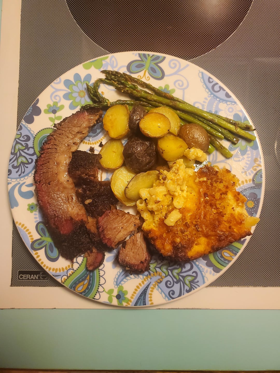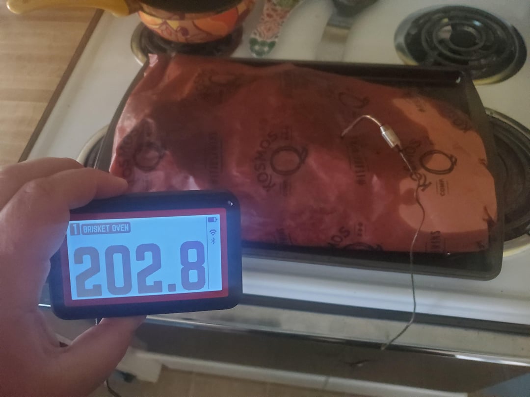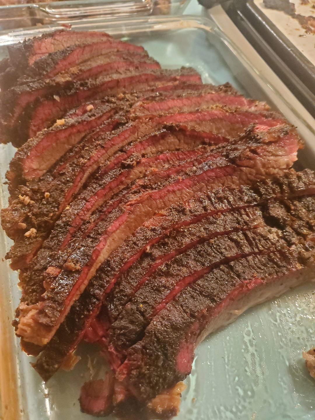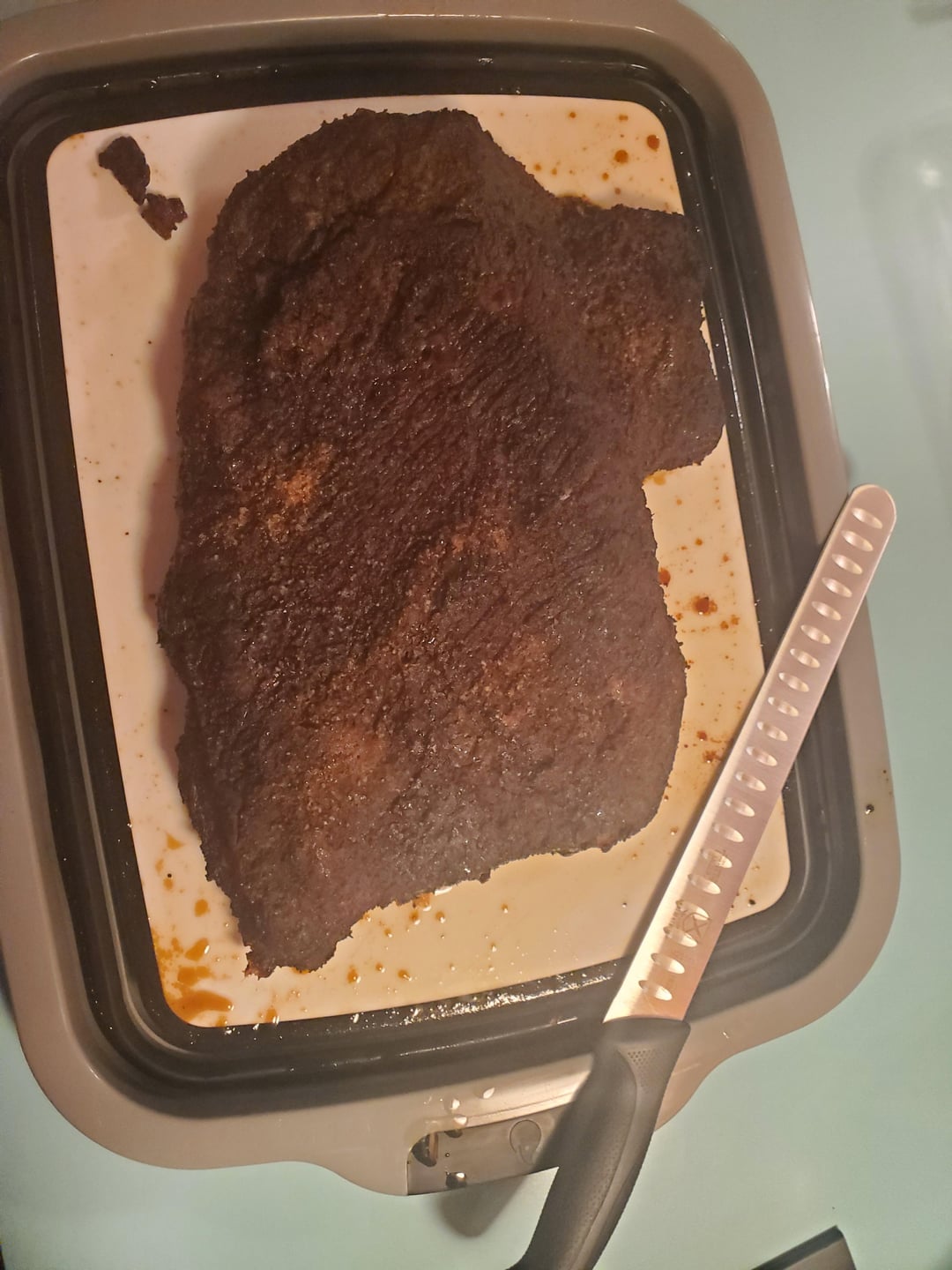 11.29 lb USDA Choice from Costco with a mustard binder, "Lott Bull" red dirt, and my own coarse SPG. Went on the Yoder with a pan of beef broth and fat trimmings (to make beef tallow), and wrapped in butcher paper with the tallow. Complete after about 13 hours and rested until dinner.