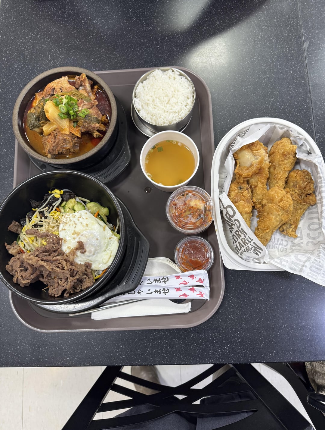 Pork neck bone soup, bibimbap, fried chicken drumsticks & tuna kimbap at Galleria Supermarket in Toronto