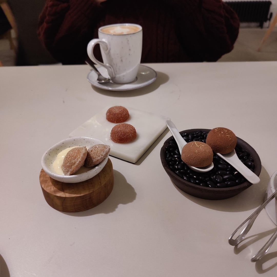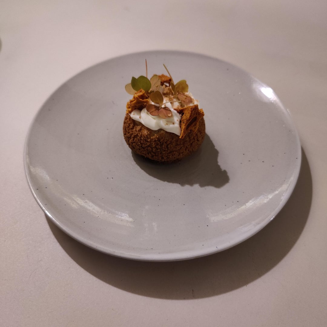 Desserts were all thoughtfully well executed. A lovely palate cleanser of compotes, brown butter and some type of very light moose followed by a fun dish called "When Daisy met Bramble", a floral ice cream on top of fruit compote, shaved fudge and spices. This was delicious. a third and final dessert arrived of some sort of choux piped with maple, a light nutty cream, hazelnut.