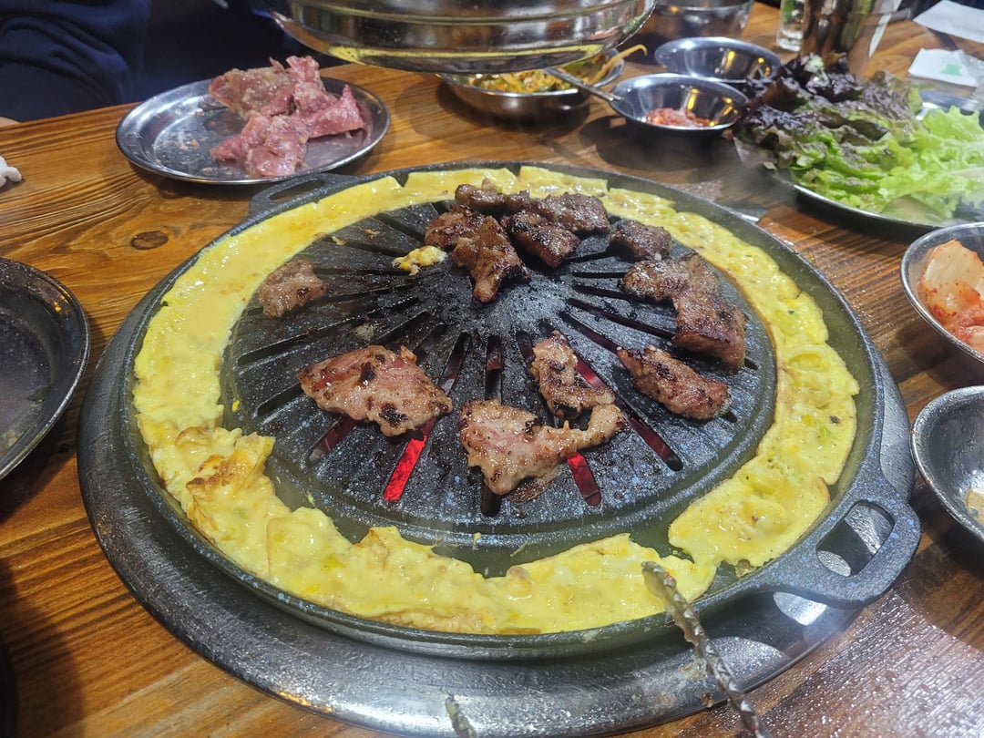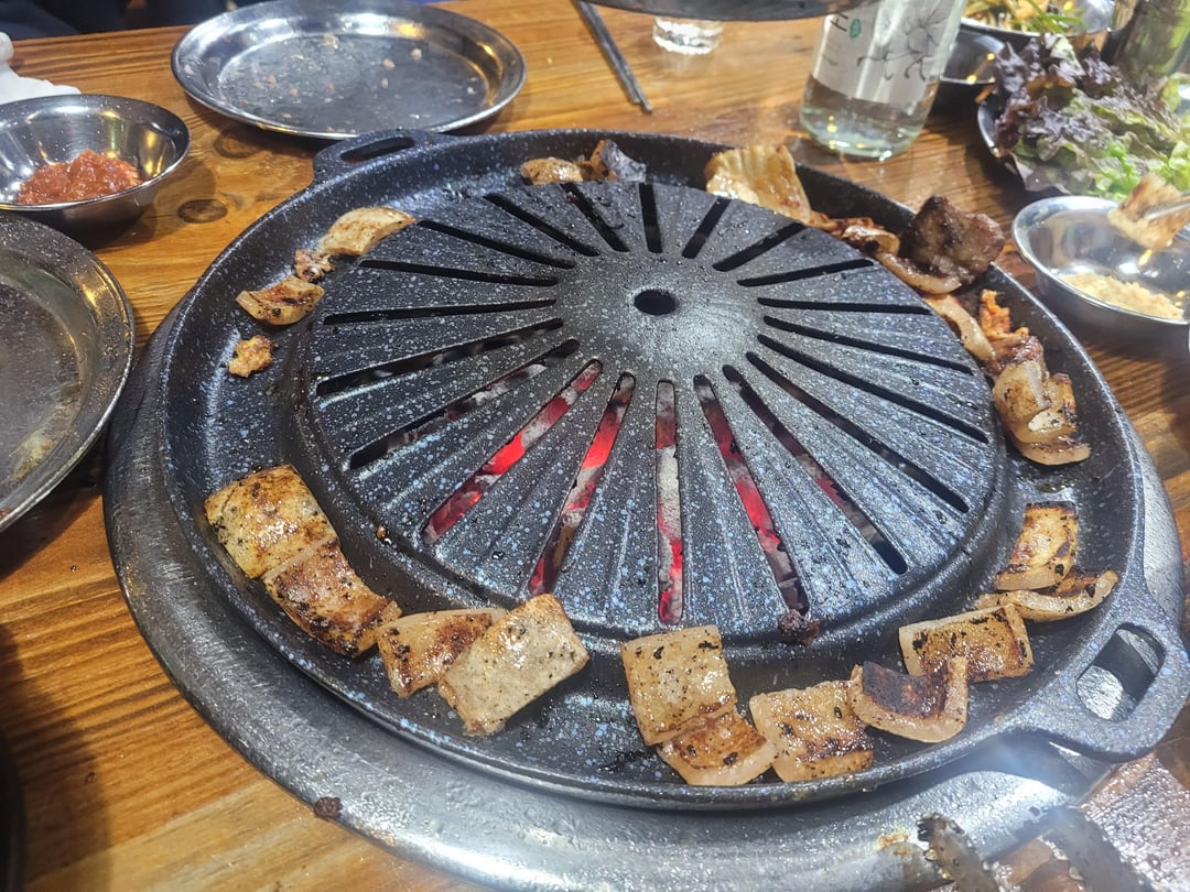 We've got fresh samgyeopsal (pork belly) and moksal (pork shoulder) grilling up nicely. The sound of the sizzling meat is just irresistible! Served with some kimchi and other banchan, of course. What's your favorite KBBQ side dish? #KoreanBBQ #KFood #PorkBelly #KoreanCuisine