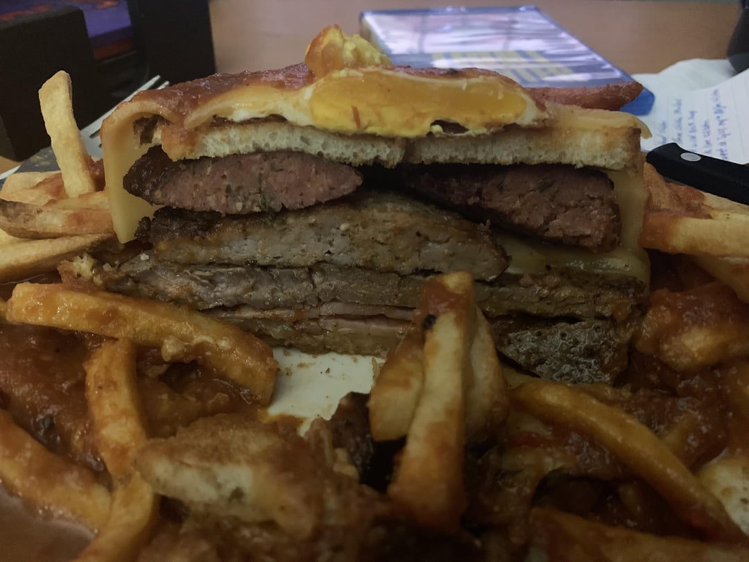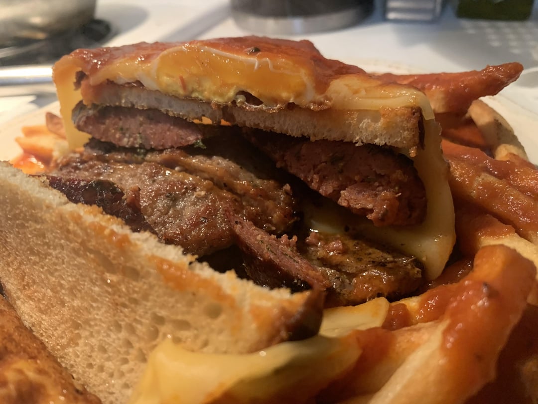 This was a bucket list sandwich for me, bread cheese, ham, steak, two types of sausage then egg and more cheese smothered in a spicy tomato sauce. This is a TOP TIER sandwich!