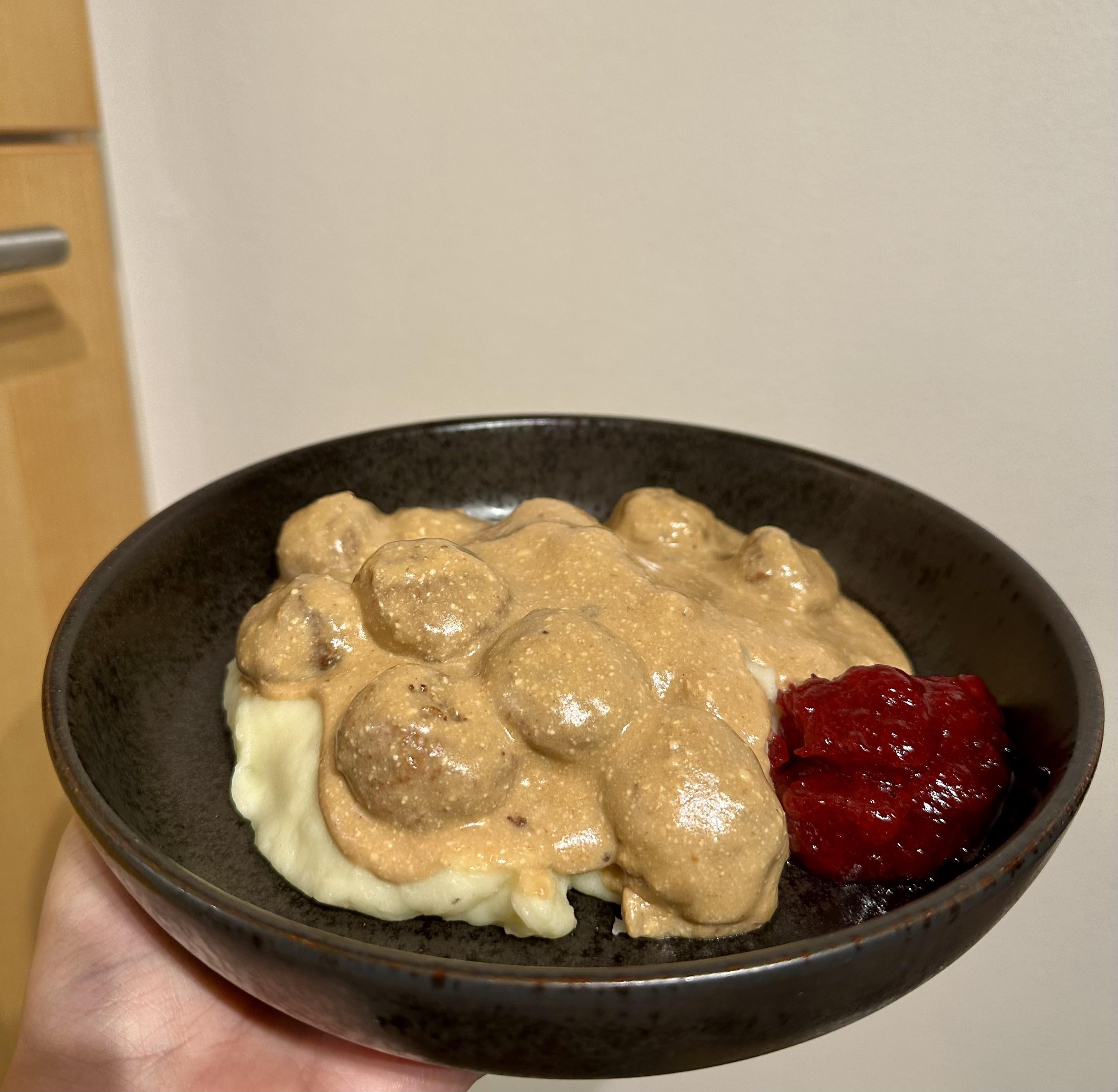 Comfort dish. Swedish meatballs with mashed potatoes and Lingonberry