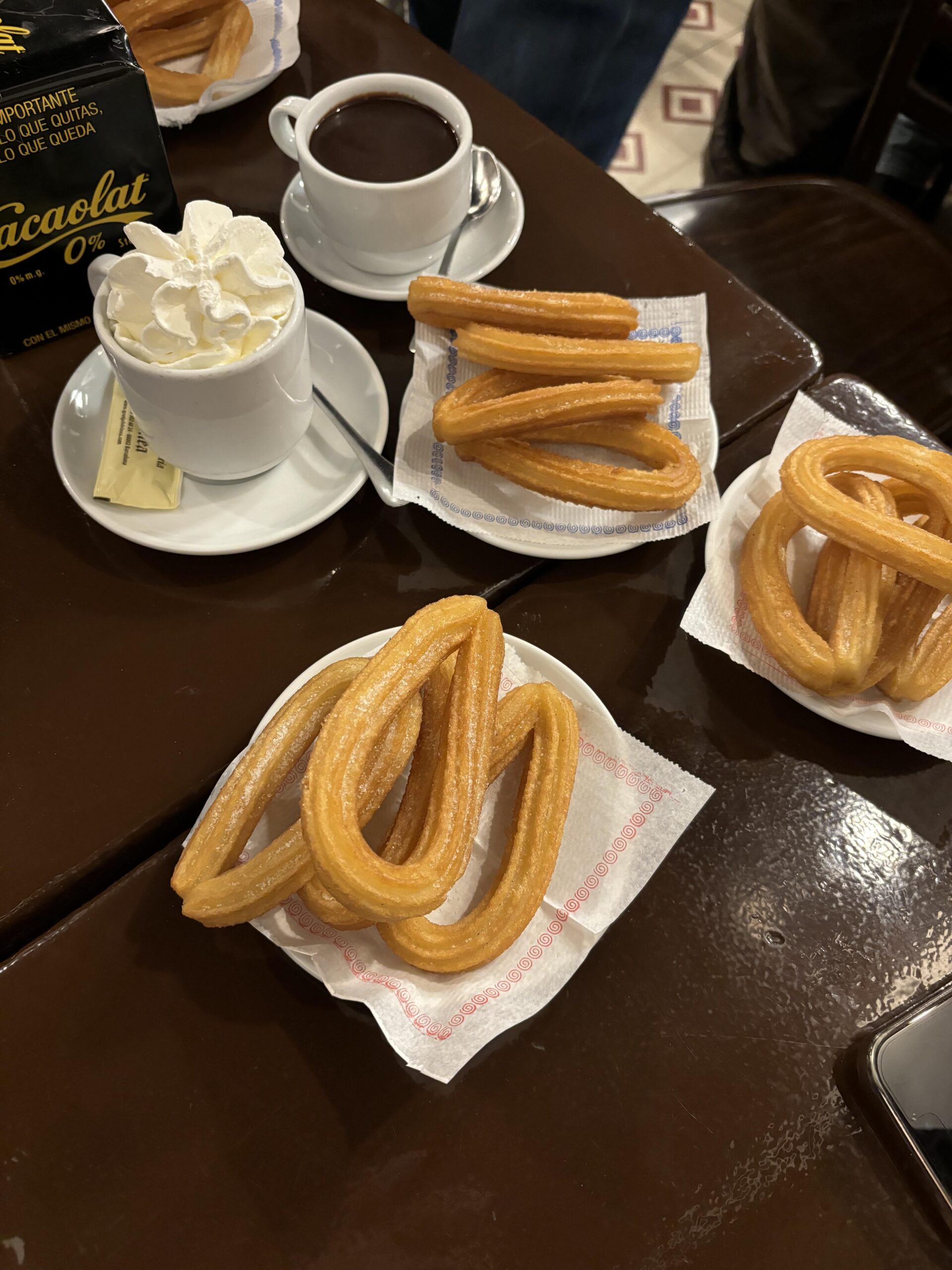 Churros with Chocolate and also Swiss Chocolate (the one with cream). From Granja Dulcinea in Barcelona.