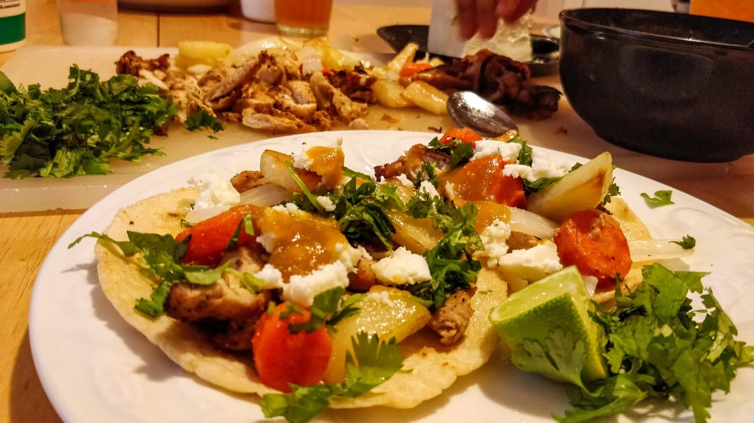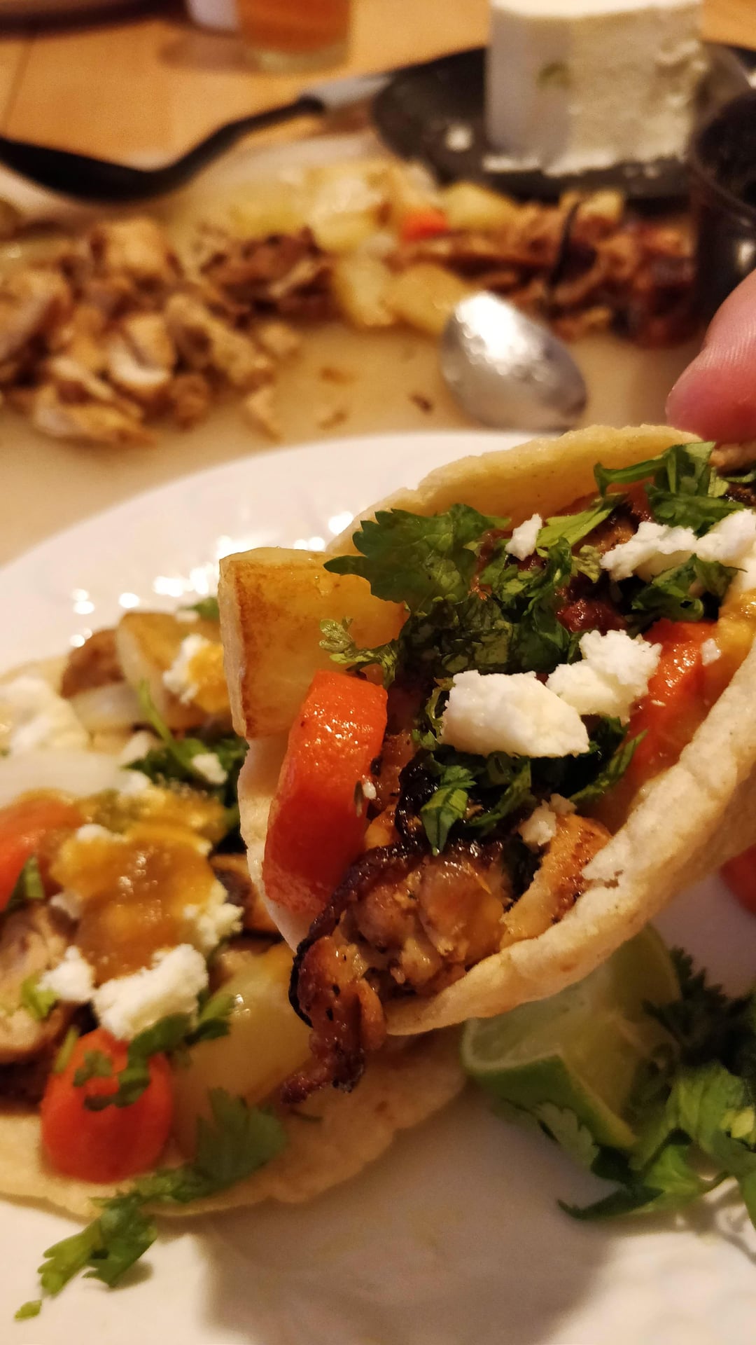 Today was Tacos de pollo Regio. I grew up close to Monterrey and also spent some time in Tampico, hence the grilled potatoes, carrots and onions.