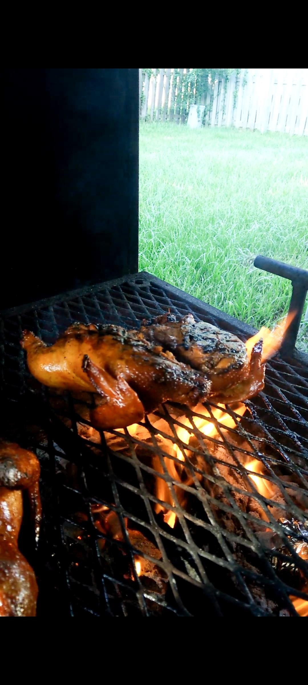 Recipe will be in the comments, but to keep it short this is an overnight brine. Chicken is spatchcocked and first grilled indirectly once at 140 i move it straight on the coals and give it the regio baste which is a Italian dressing baste with beer and lemon.