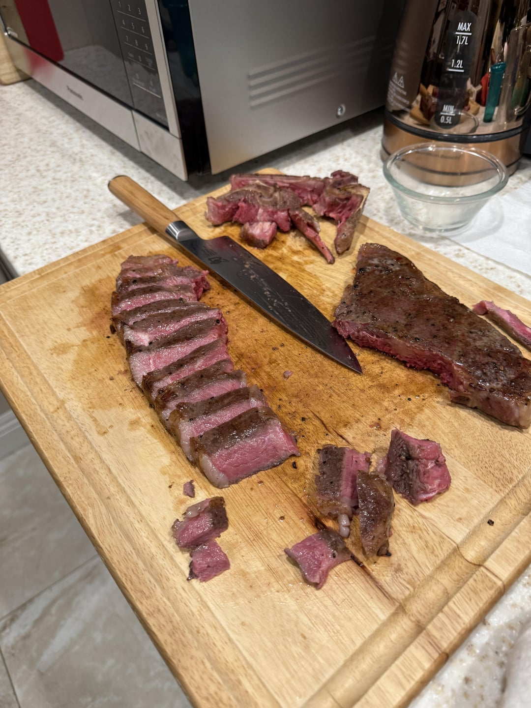30 second sear on each side on the blackstone (outside so house doesn’t get Smoky)… also could use more crust.